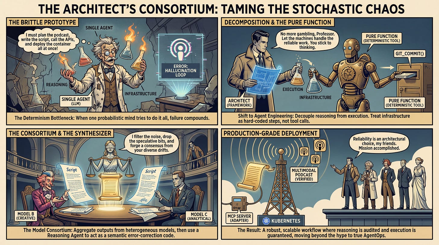 WHAT was done? The authors present a comprehensive engineering framework for transitioning agentic AI from experimental notebooks to production-grade Kubernetes environments. Using a “News-to-Podcast” generation workflow as a case study, they propose nine specific design patterns—such as “Pure Functions over Tool Calls” and “Consortium-based Reasoning”—to mitigate the non-determinism inherent in Large Language Models (LLMs).