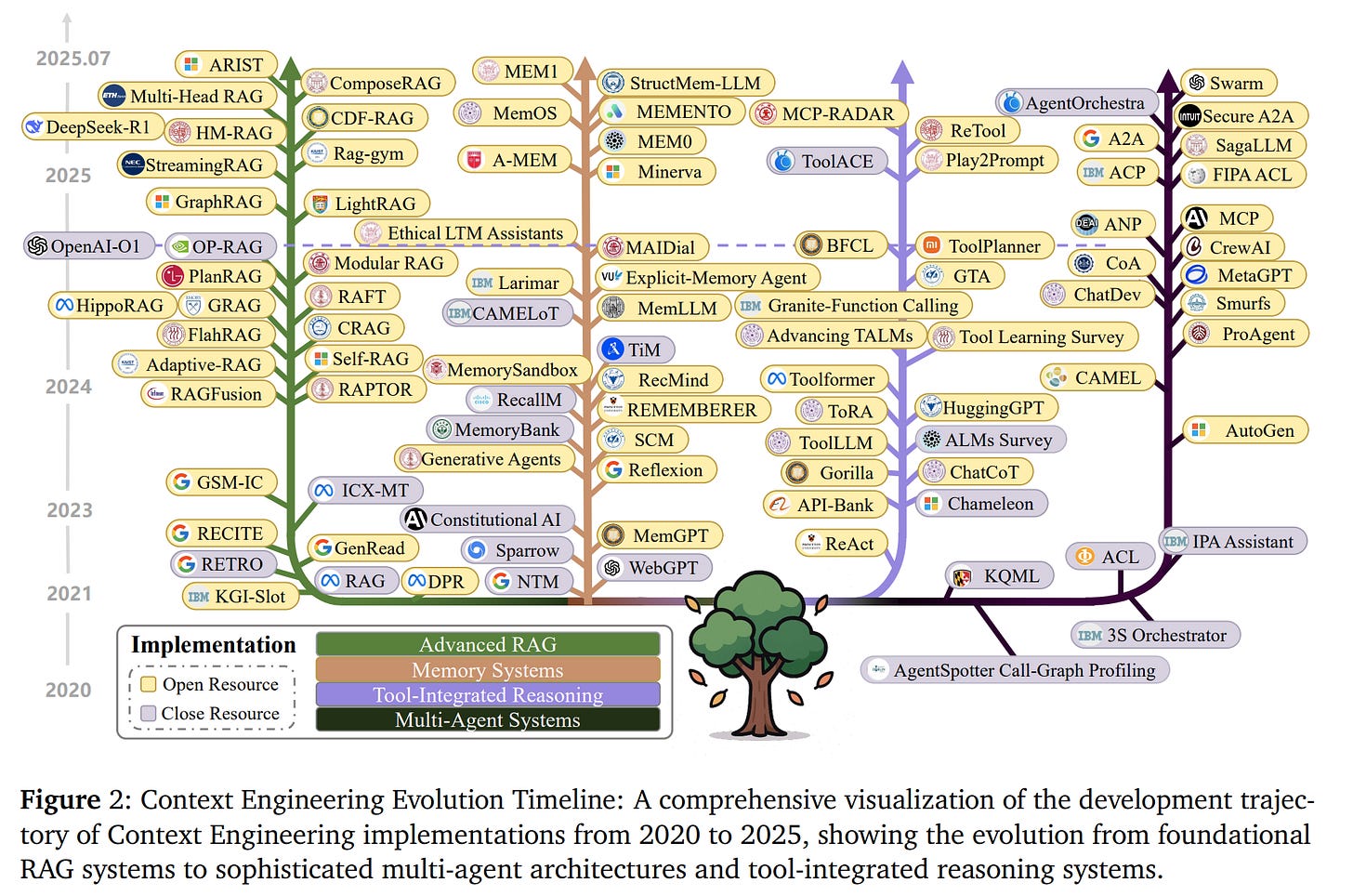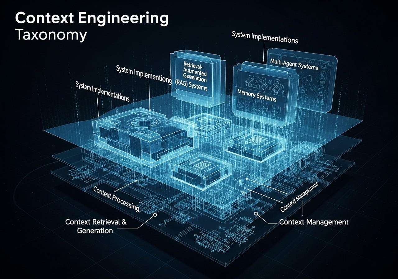 WHAT was done? This survey introduces and formalizes "Context Engineering," a discipline for the systematic optimization of information payloads for Large Language Models (LLMs). The authors present a novel, comprehensive taxonomy that deconstructs this field into two primary layers: foundational Components (Context Retrieval and Generation, Context Processing, Context Management) and sophisticated System Implementations (Retrieval-Augmented Generation, Memory Systems, Tool-Integrated Reasoning, Multi-Agent Systems). By analyzing over 1400 papers, the work formalizes context not as a static string but as a dynamic set of components, framing its assembly as an optimization problem grounded in information theory and Bayesian inference.