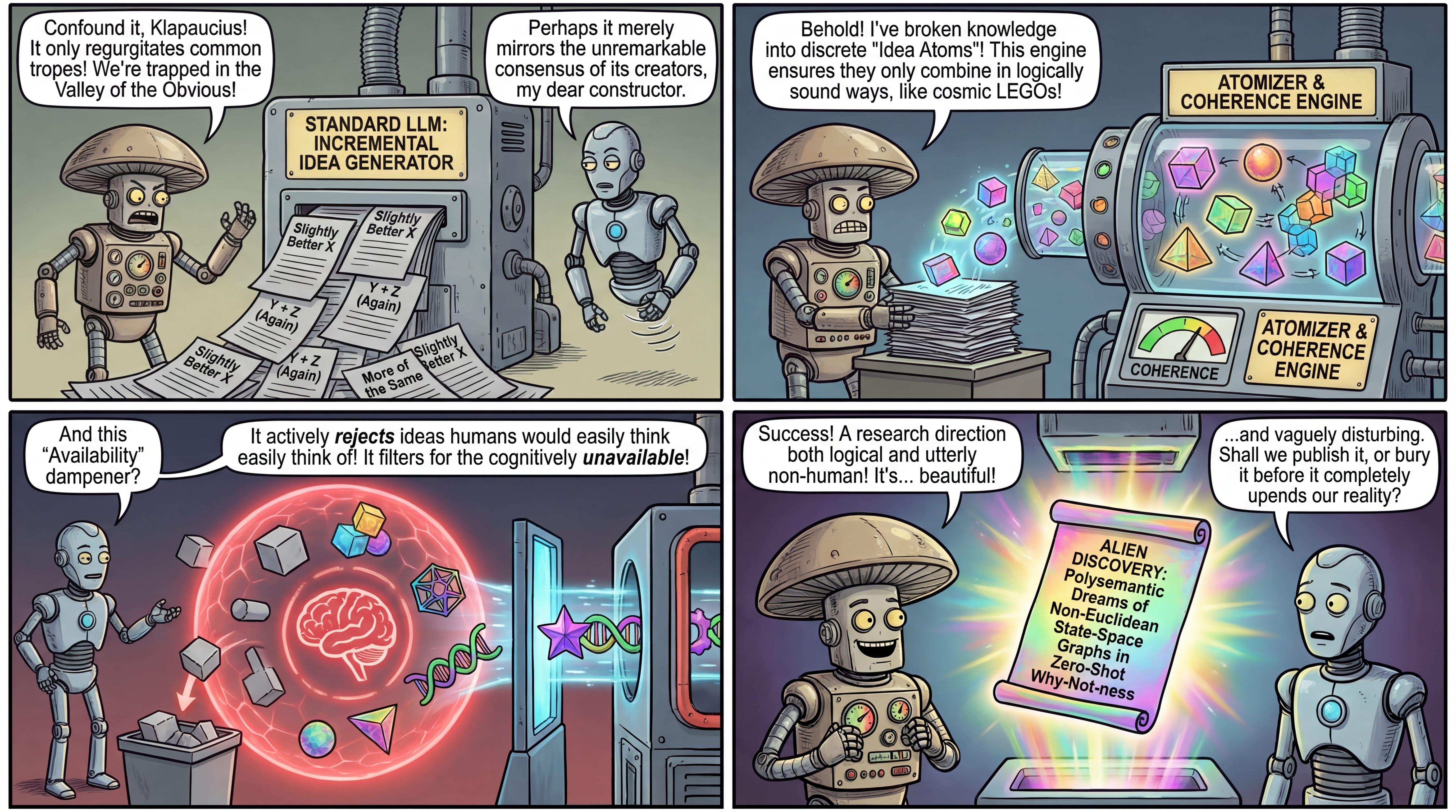 WHAT was done? The authors introduced a pipeline that decomposes thousands of machine learning papers into discrete “idea atoms,” then trains two generative models: one to maximize the structural coherence of atom combinations, and another to minimize their cognitive availability to typical researchers. By fusing these models, the system samples “alien” research directions that are logical but highly unlikely to be proposed by human scientists.