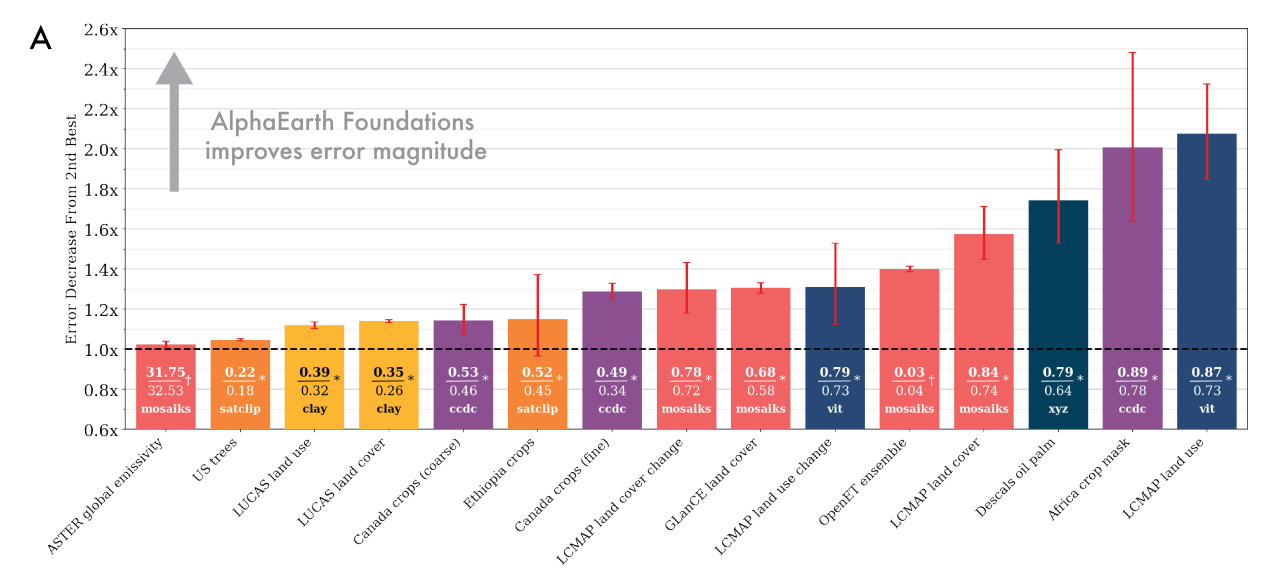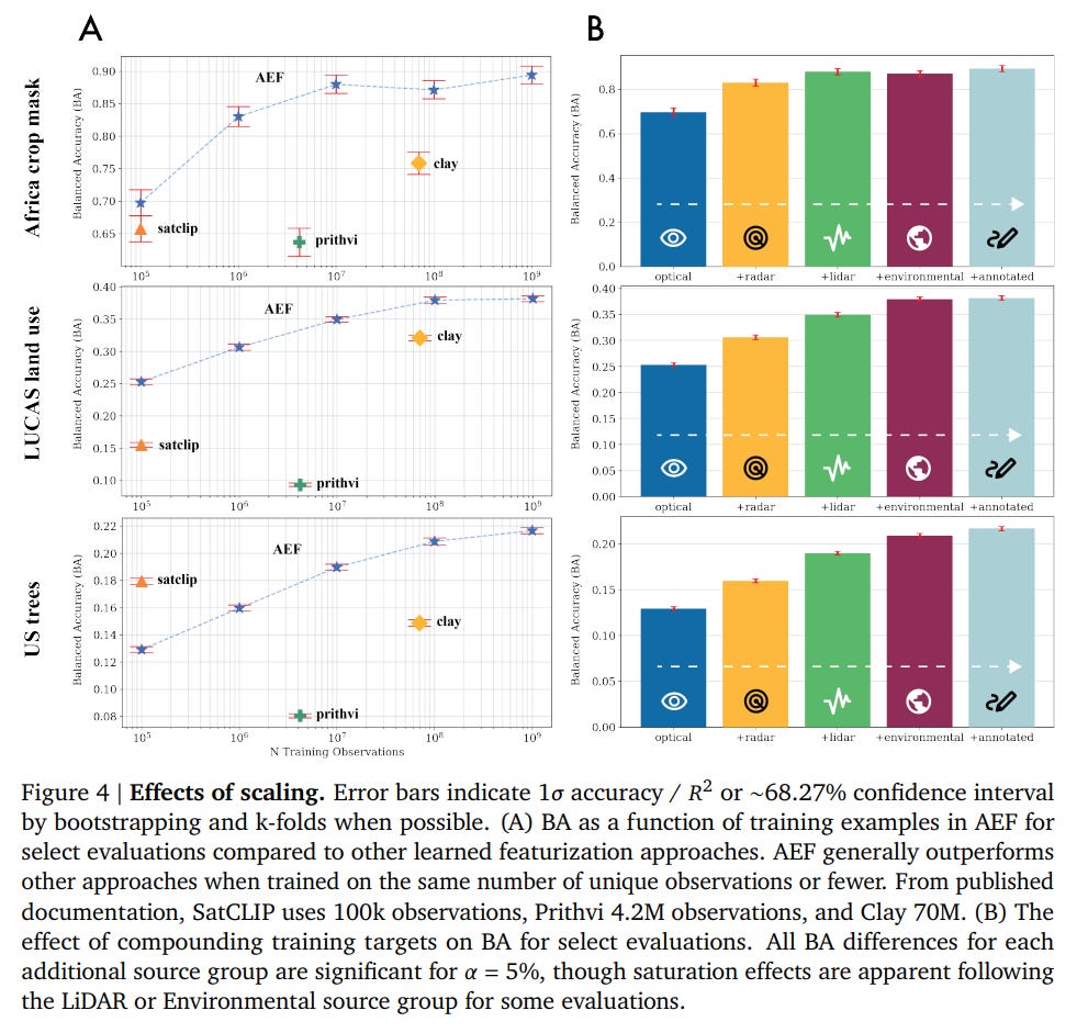 WHY it matters? AEF marks a paradigm shift in Earth Observation AI. It is the first task-agnostic model to consistently outperform all tested baselines—both engineered and learned—across a wide range of mapping applications without any re-training, reducing error by ~24% on average. By effectively translating sparse labels into detailed global maps, it tackles the dual challenges of data scarcity and volume. The public release of annual embedding fields from 2017-2024 democratizes access to high-performance geospatial analysis, enabling practitioners to build advanced monitoring systems for food security, conservation, and disaster response with unprecedented efficiency.