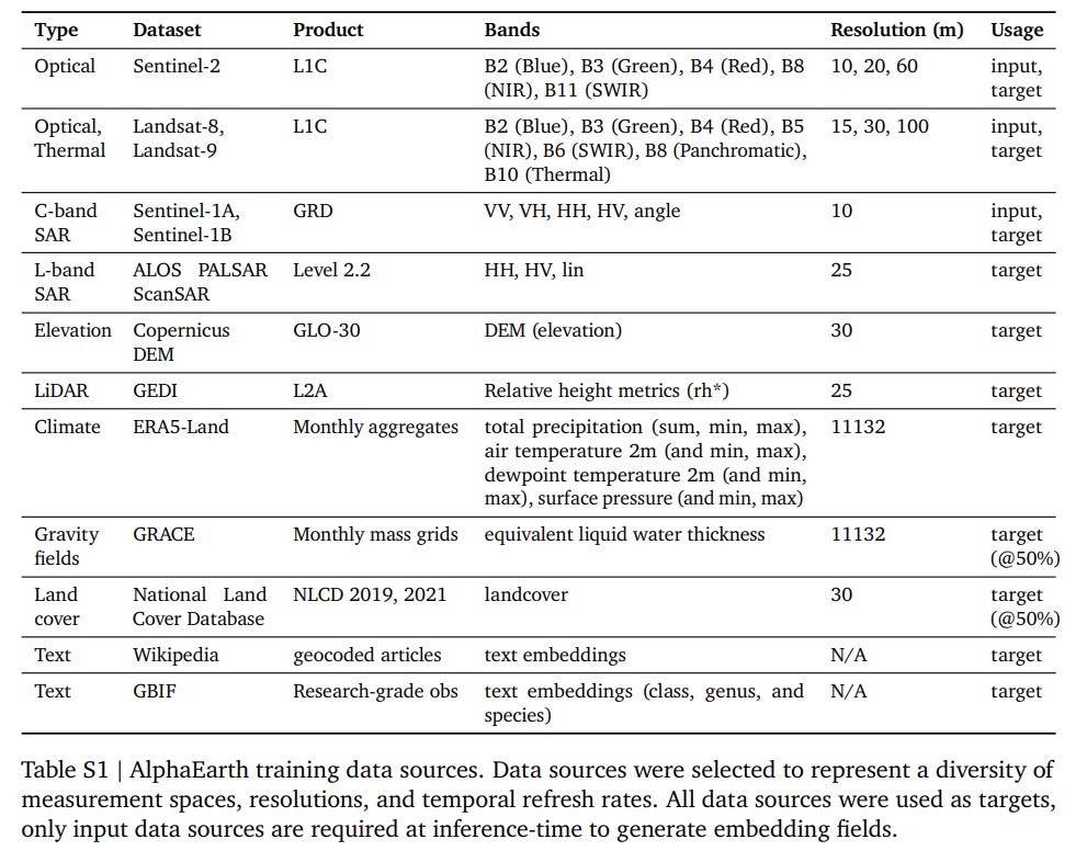The core contribution of the paper is AlphaEarth Foundations (AEF), an embedding field model that generates a universal, task-agnostic representation of the Earth. Instead of creating bespoke features, AEF learns a single, rich embedding for any 10m² patch of the planet by assimilating information from a vast and diverse array of sources. These include optical (Sentinel-2, Landsat), radar (Sentinel-1, PALSAR-2), LiDAR (GEDI), and even unstructured geotagged text from Wikipedia and the Global Biodiversity Information Facility (GBIF) (Table S1).