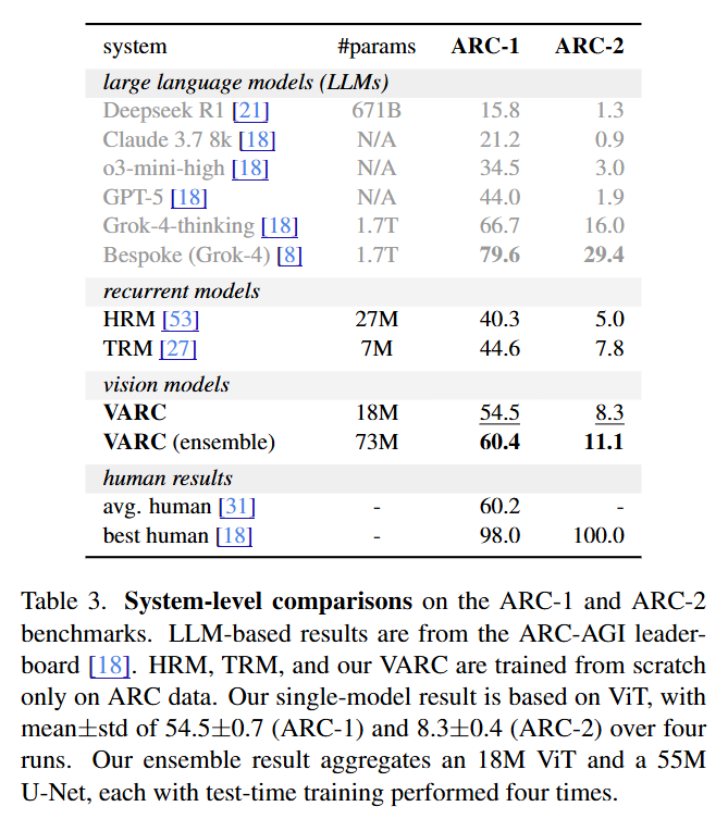 WHY it matters? This approach challenges the prevailing dominance of Large Language Models (LLMs) in abstract reasoning. With only 18 million parameters, VARC achieves 54.5% accuracy (60.4% with ensembling) on ARC-1, rivaling average human performance and outperforming massive LLMs like GPT-5 that lack visual grounding. It demonstrates that correct inductive biases—specifically 2D locality and scale invariance—can be far more efficient than scale.