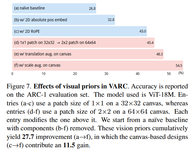While VARC closes the gap to human performance, it is not without weaknesses. The reliance on TTT significantly increases the computational cost of inference (roughly 70 seconds per task on a GPU), as the model must be trained ad-hoc for every new puzzle. Additionally, while the vision paradigm excels at spatial transformations, it is unclear how well it scales to tasks requiring abstract counting or complex logical conditionals that have no direct visual analogue. The paper notes that while visual priors solve many tasks, the model effectively treats reasoning as “image-to-image translation,” which may hit a ceiling on tasks that are visually abstract but logically deep.