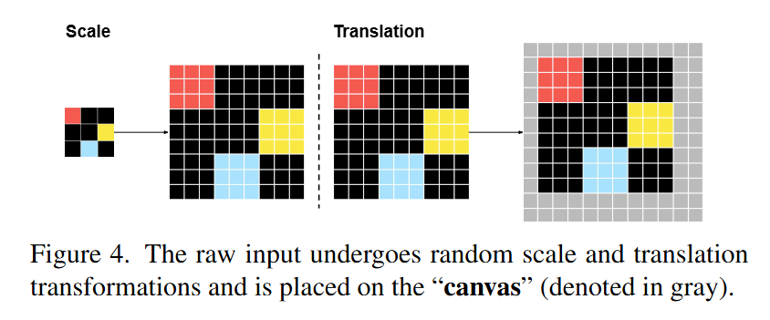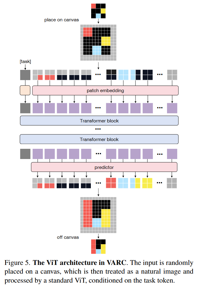 Mathematically, the input x is no longer a sequence of tokens t_1, ... t_n, but a tensor x∈RC×H_canvas×W_canvas. The discrete colors of ARC are mapped to learnable embeddings, but crucially, they are processed through mechanisms that respect Euclidean distance. By decoupling the grid size from the model’s input size via this canvas, the authors enable the use of visual priors—specifically scale invariance and translation invariance—which are enforced via data augmentation rather than architectural hard-coding alone.