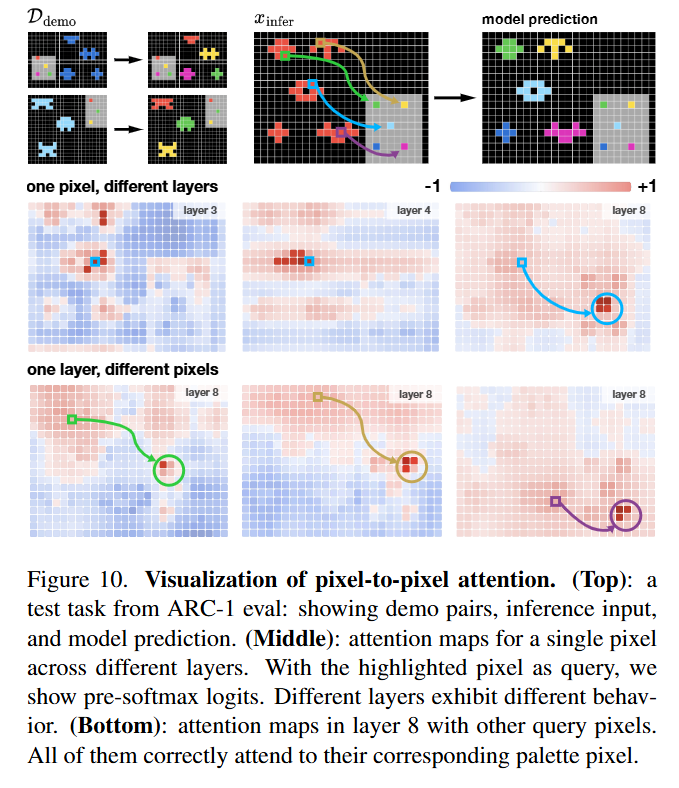 The shift from a naive baseline to the “Canvas” representation (enabling scale and translation augmentation) contributes a massive 11.5% gain in accuracy. This confirms that the difficulty in ARC is often not the logical reasoning itself, but the visual recognition of the objects being manipulated. Furthermore, the visualization of attention maps in (Figure 10) reveals that the model learns to attend to relevant source pixels—effectively learning a “copy” operation purely through attention mechanisms without explicit pointer networks.