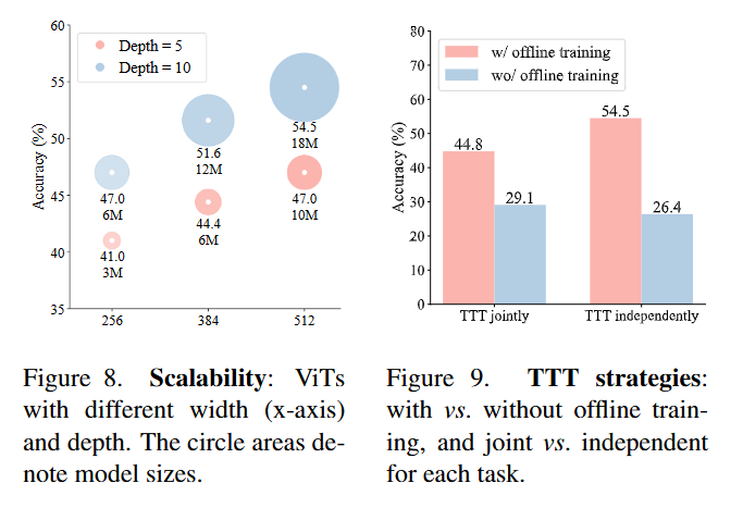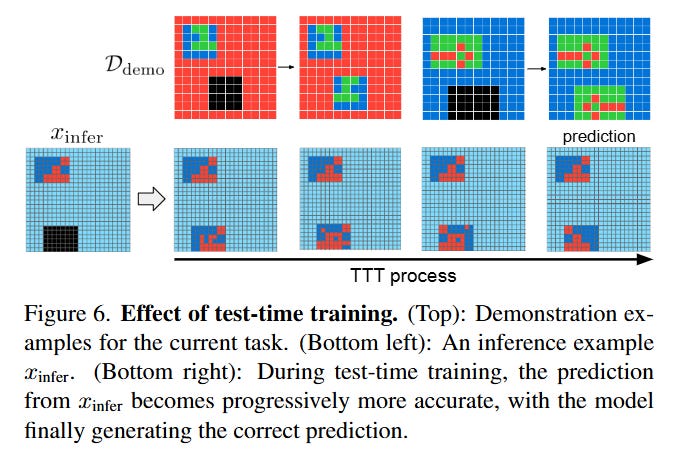 This essentially forces the model to “overfit” to the task-specific rule before making a prediction on the test input. As shown in (Figure 9), performing this TTT independently for each task yields significantly better results than joint training, preventing interference between distinct reasoning rules.