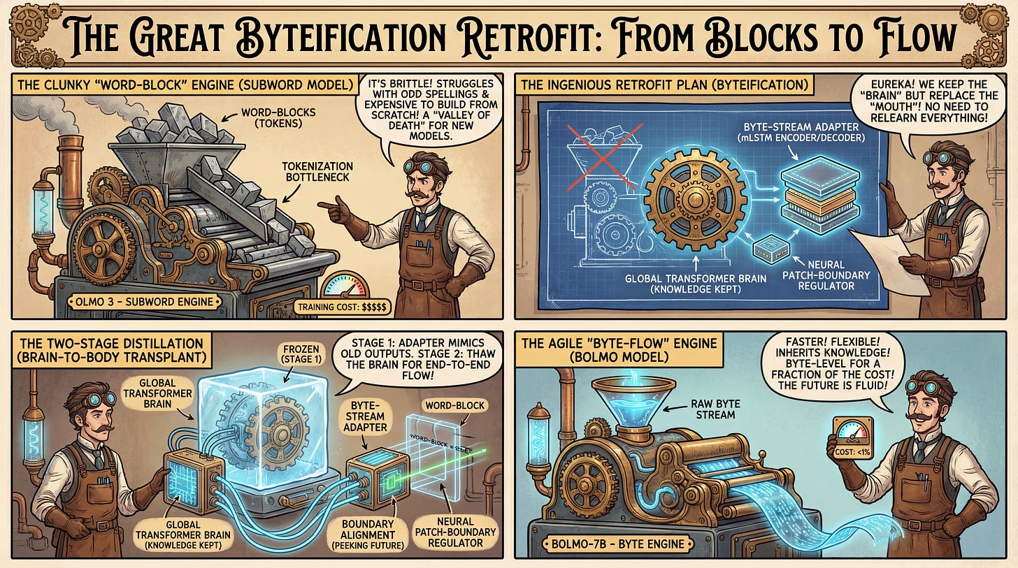 WHY it matters? Byte-level models (BLMs) theoretically solve major issues like tokenization bias, vocabulary bottlenecks, and character blindness, but they have historically been prohibitively expensive to train to state-of-the-art levels. This work provides a generalizable recipe to “retrofit” high-performance subword models into byte-level models efficiently. Crucially, it demonstrates that these retrofitted models can inherit the post-training ecosystem (e.g., instruction tuning) of their parents via weight merging, bypassing the need to rebuild the entire safety and alignment pipeline for byte-level architectures.