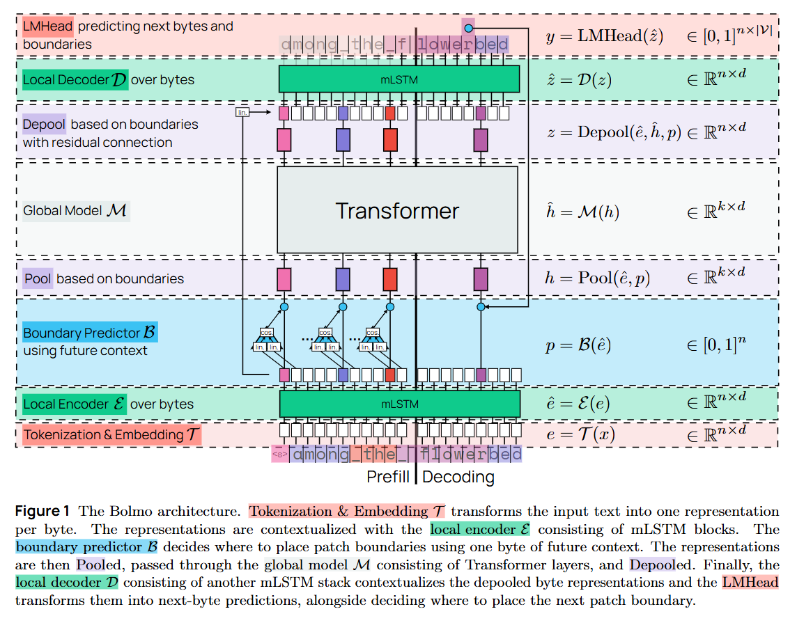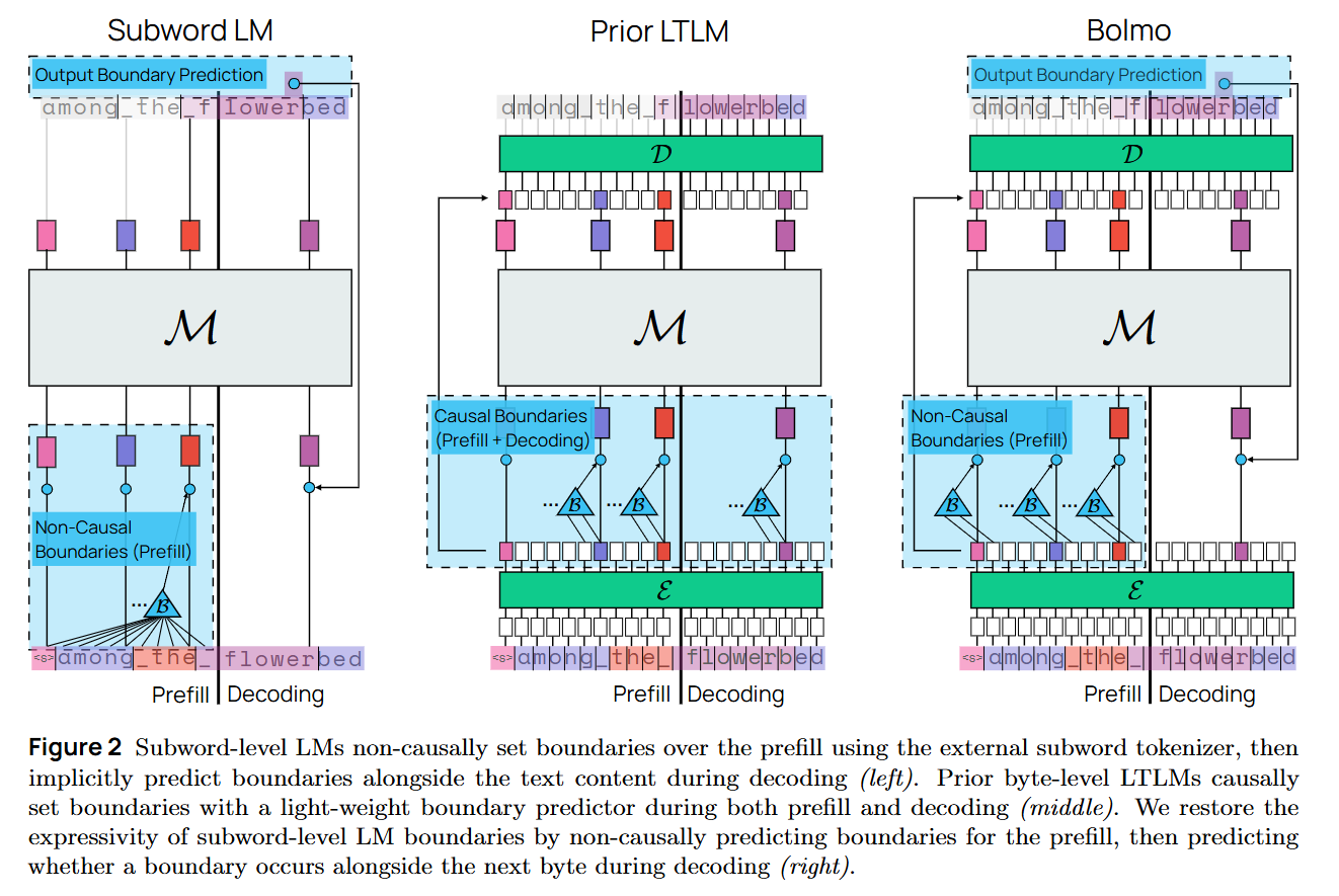 Furthermore, the reliance on an explicit <b> boundary symbol during decoding introduces a slight discrepancy between the prefill (non-causal, implicit boundaries) and decoding (causal, explicit boundaries) phases. While the authors manage this via boundary symbol fusion (expanding the vocabulary size to 512 to include “byte+boundary” tokens), it adds architectural complexity compared to a pure homogeneous transformer.