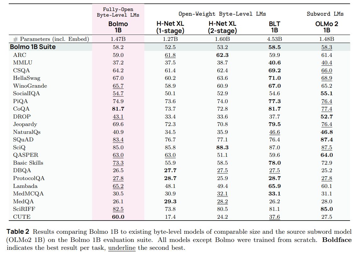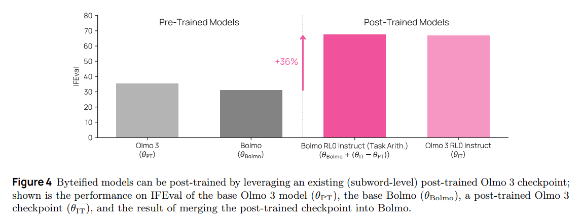 The paper also highlights a unique capability: Post-Training via Task Arithmetic. Because the global weights of Bolmo are topologically identical to Olmo 3 (mostly), the authors show in Figure 4 that one can take the weight delta of an instruction-tuned Olmo 3 and add it to base Bolmo. This successfully transfers instruction-following capabilities to the byte-level model without requiring expensive RLHF runs on the byte-level architecture itself.