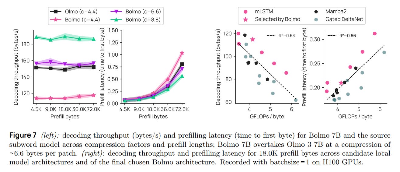 While the prefill speed is competitive due to parallelization, decoding speed remains a challenge. Even with mLSTMs, the model must execute the local decoder multiple times per patch. While the patch generation rate is faster than subword token generation, the sheer volume of bytes means wall-clock time can lag behind highly optimized subword kernels, though Bolmo closes this gap significantly compared to previous attempts.