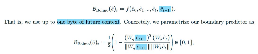 To solve this, Bolmo introduces Non-Causal Patch Boundary Prediction during the prefill phase. The boundary predictor B utilizes one byte of future context to align its patch decisions with the source model’s tokenizer. Formally, the probability of a boundary at step t is parametrized as: