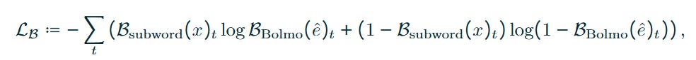To validate the efficiency of the “byteification” process, the authors utilize a loss function that combines boundary supervision (matching BPE boundaries initially) with next-byte prediction. The boundary loss LB is defined as: