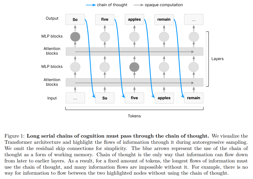 For sufficiently difficult tasks requiring serial cognition, the paper posits that the Transformer architecture's limitations effectively force the model to use its own generated text as a form of working memory (Figure 1). In a standard Transformer, information flows in one direction; the model cannot 'look back' at its earlier internal states (activations) without writing them down in the text sequence it is generating. This turns the "chain of thought" into the only available scratchpad for complex, multi-step reasoning, meaning crucial parts of the model's logic are externalized in human-readable language.