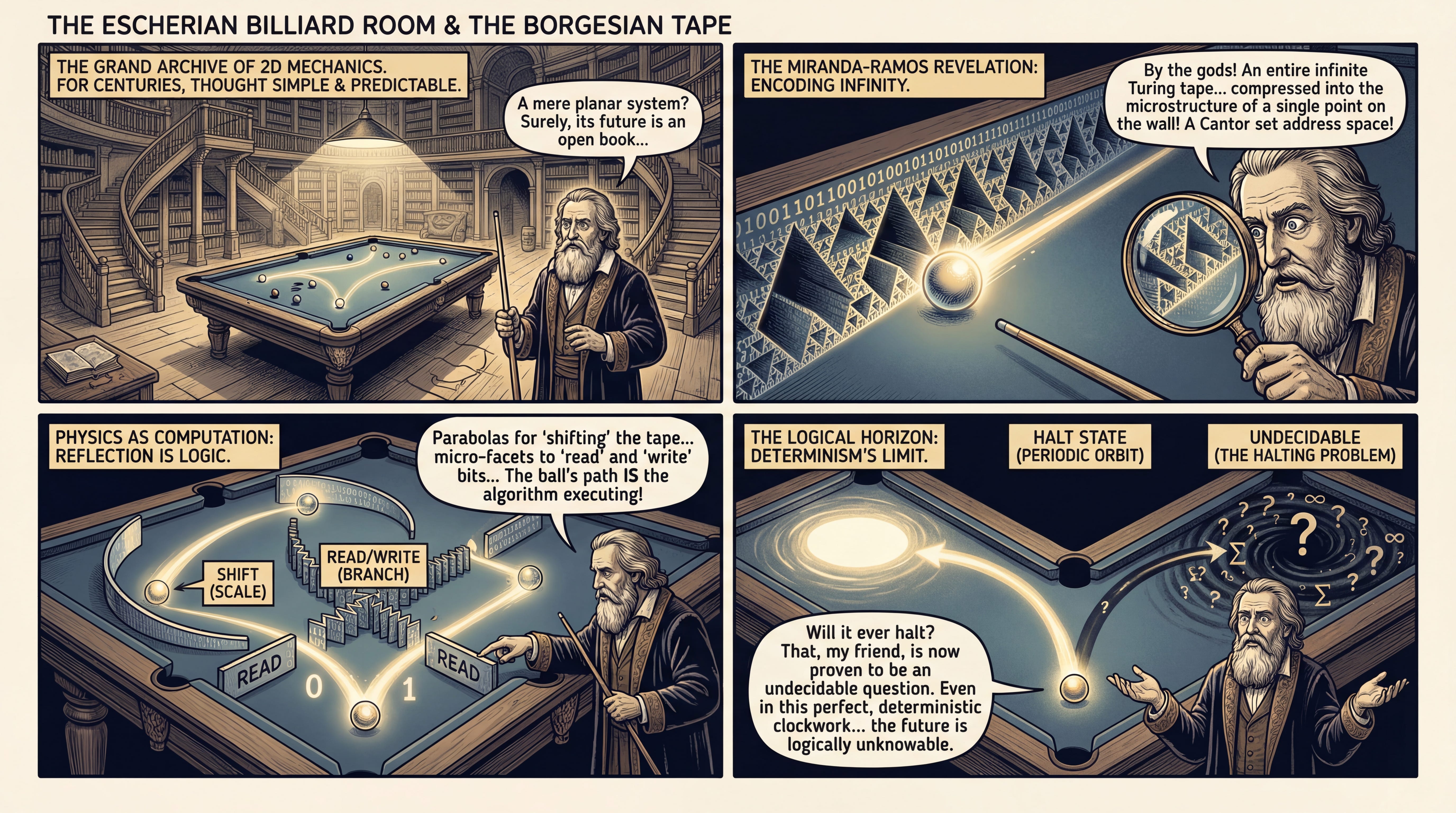 “Classical Billiards Can Compute” serves as a rigorous confirmation that complexity is ubiquitous in classical dynamics. By extending the domain of TKFT to planar billiards, Miranda and Ramos have shown that undecidability stands alongside chaos as a twin pillar of unpredictability. While chaos prevents prediction due to measurement uncertainty (Lyapunov exponents), undecidability prevents prediction due to logical irreducibility.