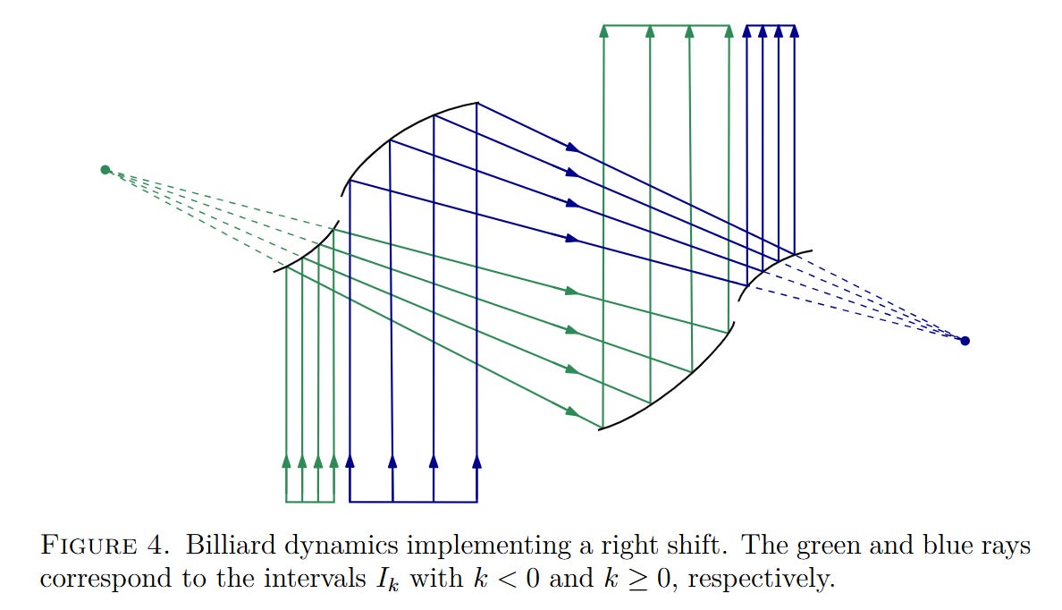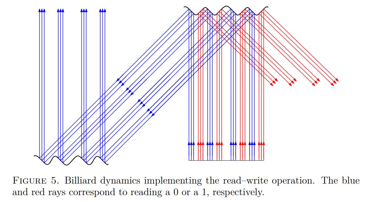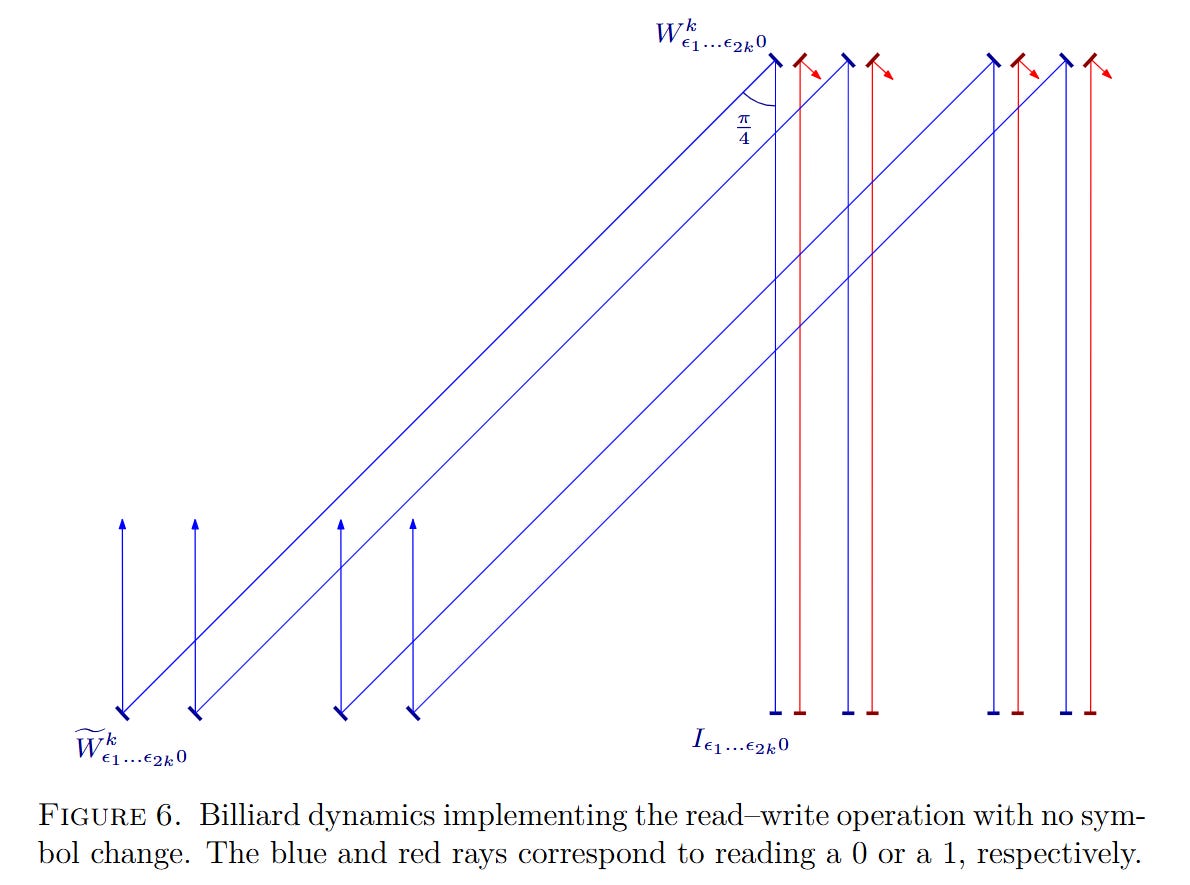 Crucially, the authors prove that these trajectories are robust enough to avoid unwanted collisions with other segments of the encoding. For the “Write” operation, the reflection angle is slightly perturbed to shift the trajectory horizontally by exactly the amount required to flip the bit in the ternary expansion. The authors define this angle αk precisely as: tanαk=1/(1+3−(3k+2)). This ensures the physical trajectory implements the symbolic update x→x±2⋅3−n without introducing errors.