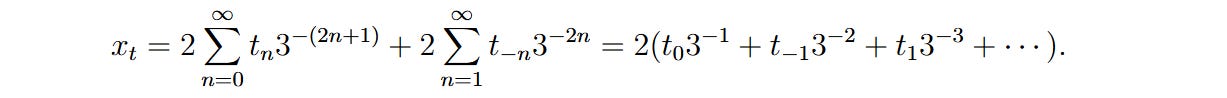 The authors employ a ternary Cantor set encoding. A tape state t={tn}n∈Z (where tn∈{0,1}) is mapped to a real number xt by interleaving the positive and negative halves of the tape into the ternary expansion. Specifically, the right side of the tape occupies odd digits and the left side occupies even digits: