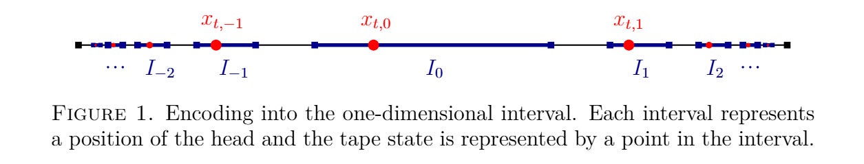 To account for the head position k, this value xt is further mapped into a sub-interval via affine embeddings τk, effectively creating a fractal address space where distinct head positions occupy disjoint segments of the unit interval. This precise encoding allows the physical variable—the collision point on the wall—to carry the full informational content of the machine.