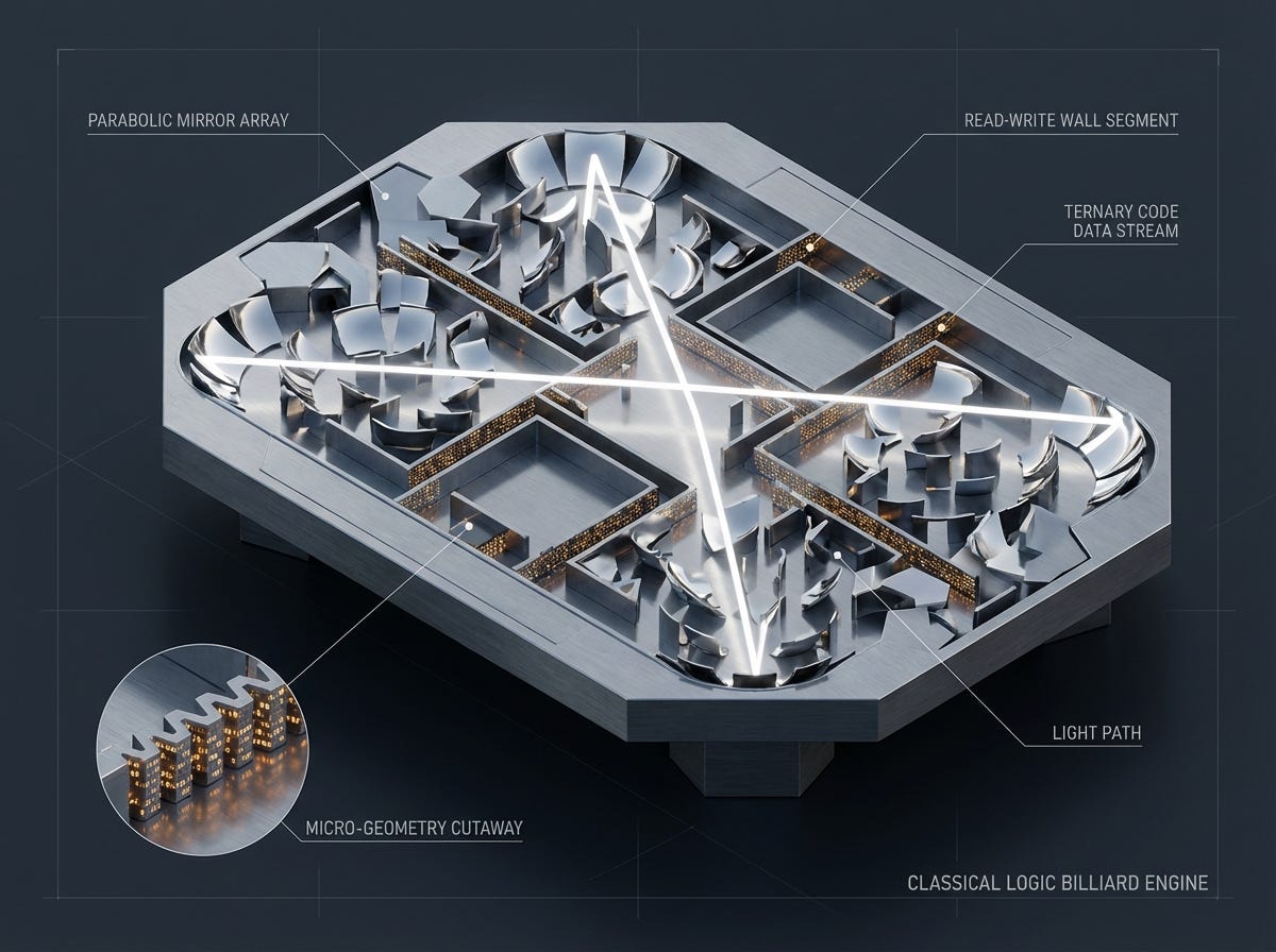 A ball entering a corridor represents the machine in a specific state. To execute a “Shift” operation (moving the head position k→k±1), the ball reflects off parabolic walls. These walls act as affine transformers; for example, a right shift is implemented by walls that scale the impact coordinate, effectively performing the arithmetic operation x↦3x (or similar affine variants) on the position coordinate. This utilizes the focusing properties of parabolas to exact the necessary multiplication in the ternary expansion.