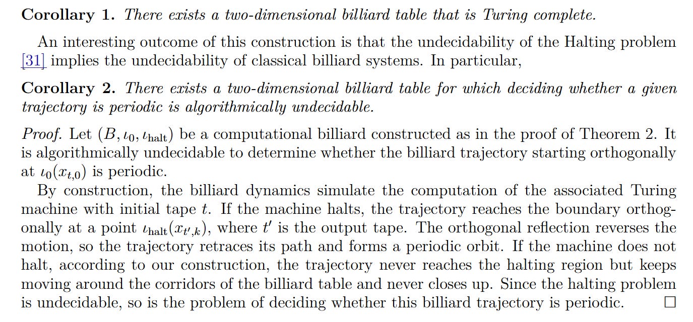 The primary finding is that the Halting Problem for the embedded Turing machine maps directly to the reachability and periodicity problems in the billiard. Specifically, the authors prove that deciding whether a trajectory starting at a specific point ι0(xt,0) ever hits the “Halt” region of the boundary is equivalent to the Halting Problem. Furthermore, because the system is reversible, if the machine halts, the particle reflects orthogonally and retraces its path, creating a periodic orbit. Therefore, Corollary 2 establishes that deciding whether a trajectory is periodic is algorithmically undecidable. This suggests that in systems approximating these billiards—such as the N-body problem in celestial mechanics or hard-sphere gases—there exist configurations where the long-term qualitative behavior cannot be predicted by any algorithm, regardless of computational power.