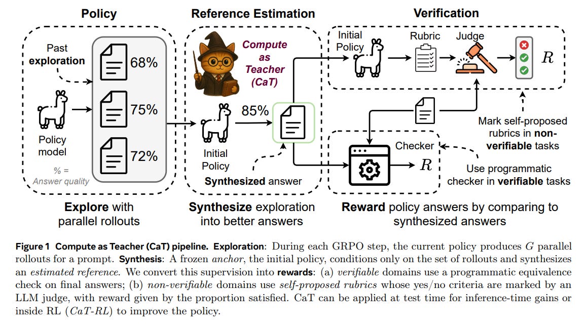 WHAT was done? The paper introduces Compute as Teacher (CaT), a method that transforms a model’s own exploratory outputs into high-quality, reference-free supervision. Instead of selecting the “best” answer from a group of parallel rollouts, CaT uses a frozen “anchor” policy to synthesize a single, improved reference by reconciling contradictions and integrating partial solutions. For verifiable tasks like math, this synthesized answer acts as a target for programmatic checkers. For non-verifiable domains like healthcare dialogue, CaT introduces a novel mechanism: the anchor generates self-proposed rubrics (fine-grained, binary criteria) from the synthesized reference, which are then scored by an LLM judge to provide a robust reward signal for Reinforcement Learning (CaT-RL).