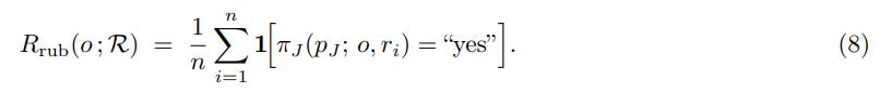 An independent LLM judge, π_J, then evaluates whether a rollout o satisfies each criterion. The reward is the proportion of satisfied criteria: