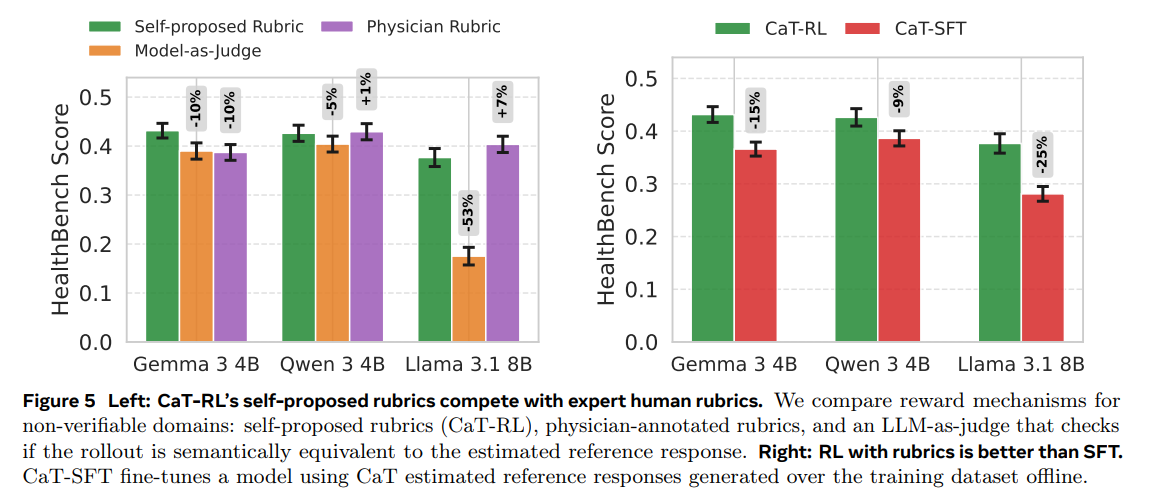 Self-Proposed Rubrics are Highly Effective: In the non-verifiable HealthBench domain, the self-proposed rubric rewards proved more effective than a standard model-as-a-judge baseline and were competitive with expert-annotated physician rubrics. Furthermore, RL with these rubrics (CaT-RL) outperformed supervised fine-tuning (SFT) on the synthesized references (Figure 5).