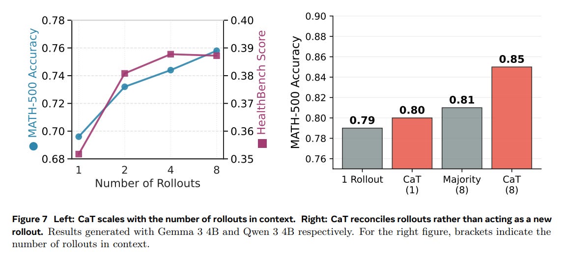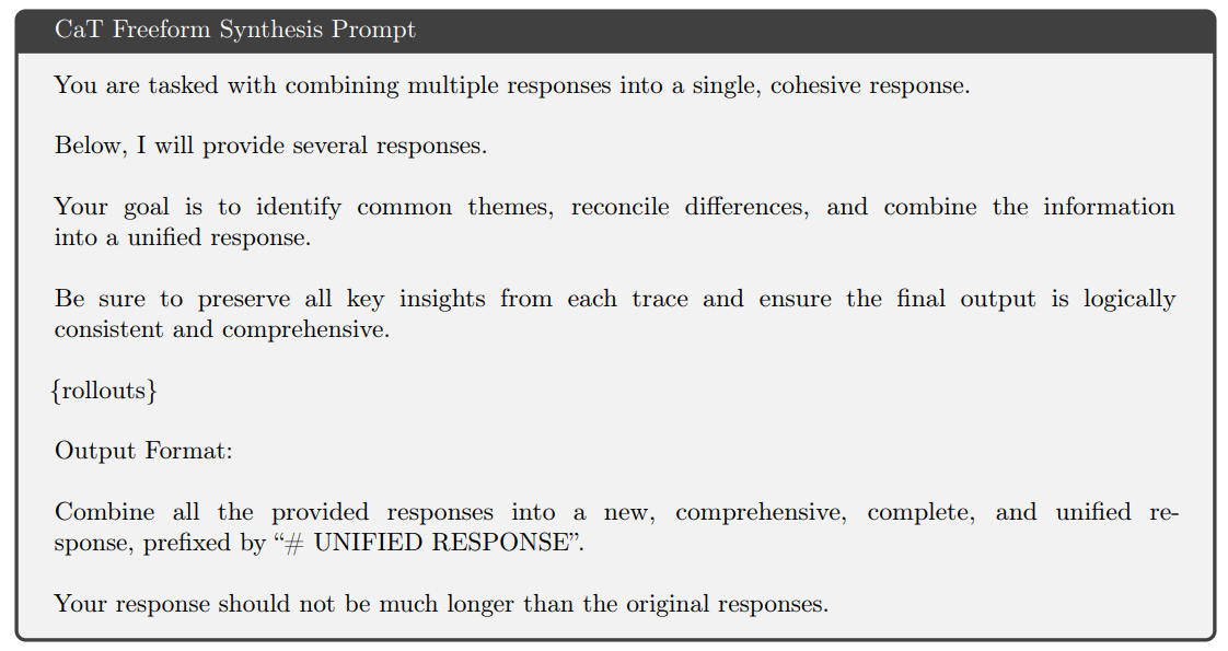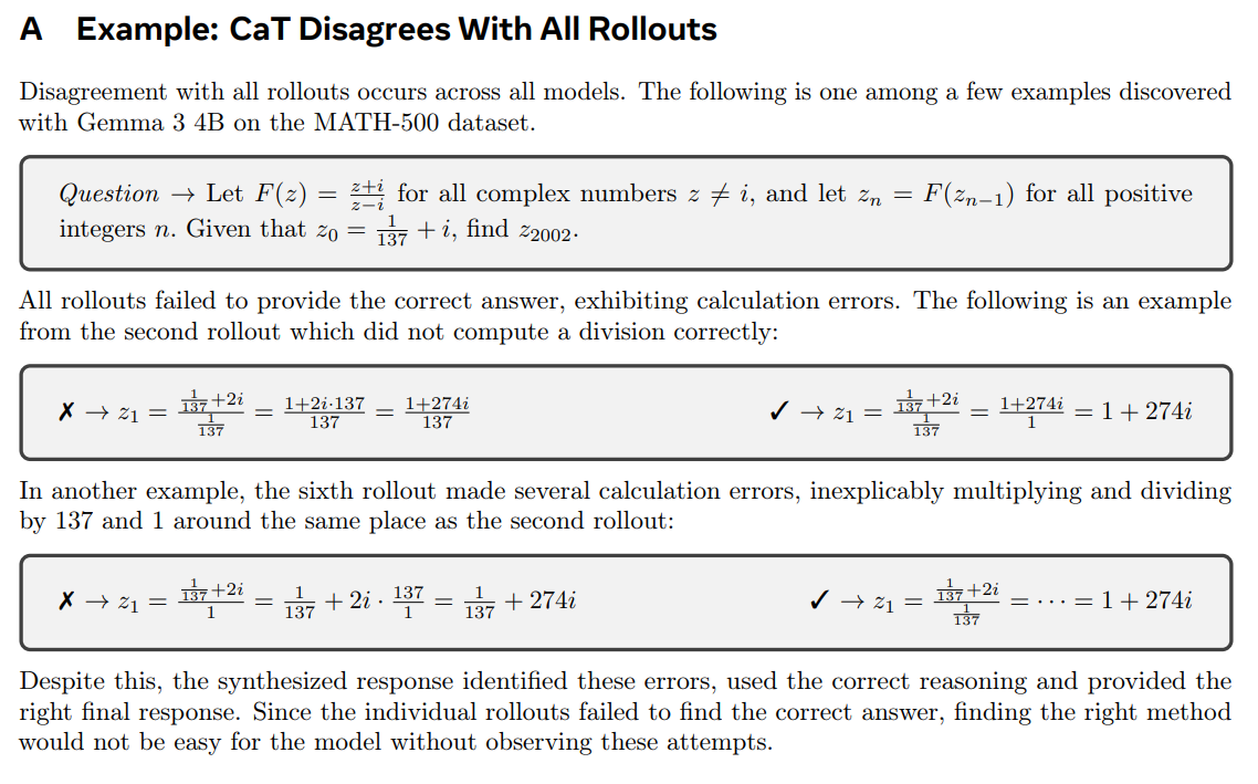 True Self-Correction: The most remarkable finding, bordering on algorithmic alchemy, is CaT’s proven ability to produce a correct answer even when every single input rollout is wrong. This occurred in approximately 1% of the challenging MATH-500 problems (Appendix A). This is not simply picking the ‘least wrong’ option; it is a genuine act of error correction and reasoning that transcends the initial distribution of answers, a capability impossible for any method based on selection. CaT also disagreed with the majority consensus 14% of the time, further highlighting its capacity for structured reconciliation.