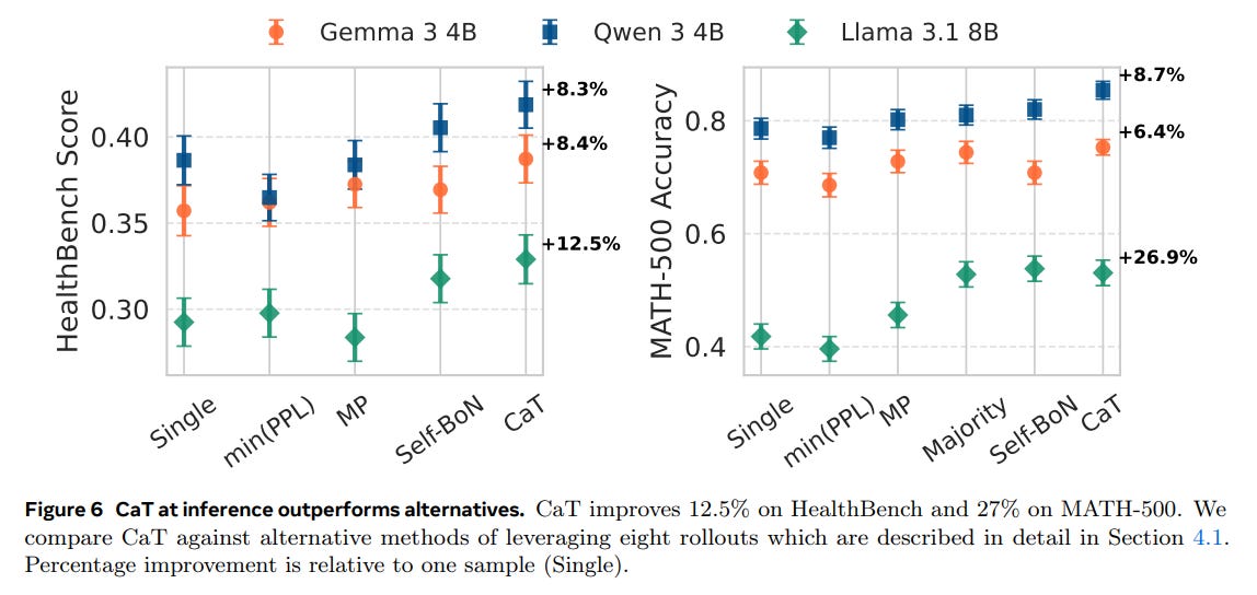 Synthesis Outperforms Selection: When used at inference time, CaT’s synthesis approach is superior to all tested selection baselines, including single-sample, minimum perplexity (minPPL), and majority voting. On MATH-500, it provides up to a 27% relative improvement over a single sample (Figure 6).
