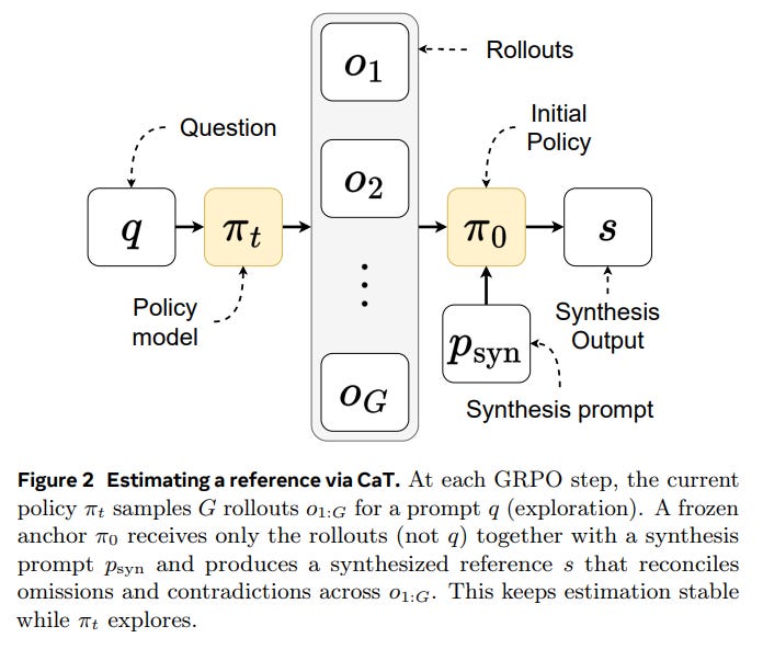 Synthesis (Reference Estimation): This is the core innovation of CaT. A frozen anchor policy, π_0 (typically the initial, pre-trained model), conditions only on the set of rollouts {o_i} and a synthesis prompt p_syn to produce a single, synthesized reference, s.