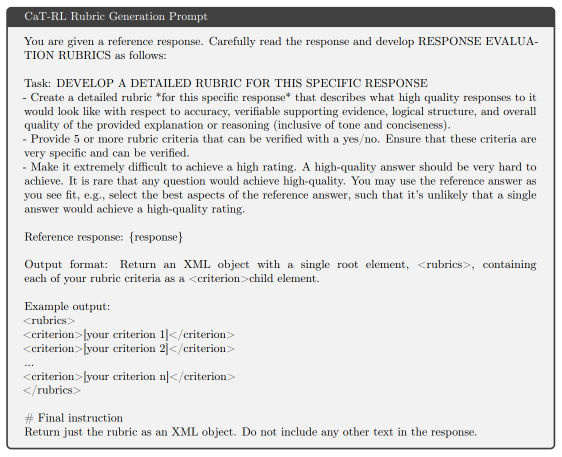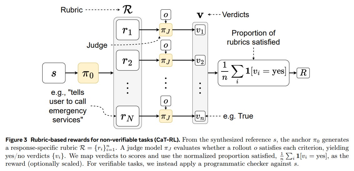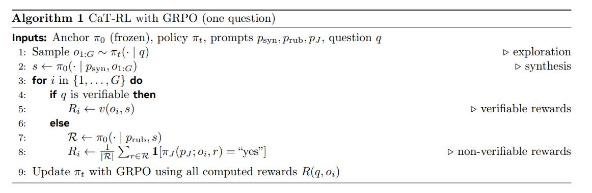 Non-Verifiable Tasks (e.g., healthcare): CaT introduces self-proposed rubrics. The anchor π_0 generates a response-specific rubric R = {r_i}—a set of binary, auditable criteria—based on the synthesized reference s.