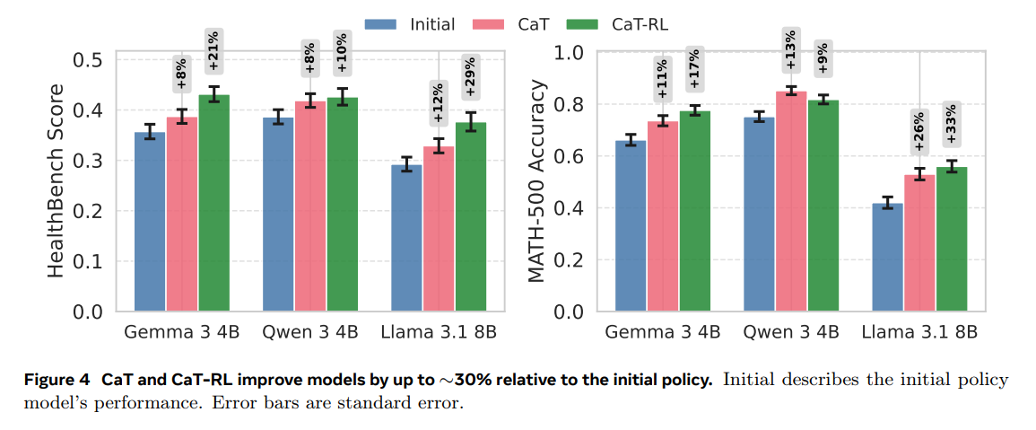 Significant Performance Gains: CaT-RL delivers substantial improvements over the initial policy, achieving up to a 33% relative gain on MATH-500 and a 30% gain on HealthBench with Llama 3.1 8B (Figure 4). The trained policy consistently improves upon the teacher signal provided by CaT, demonstrating a virtuous cycle of learning.