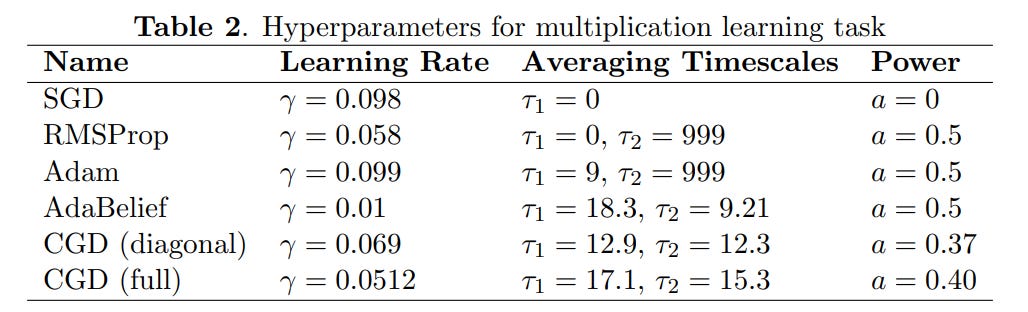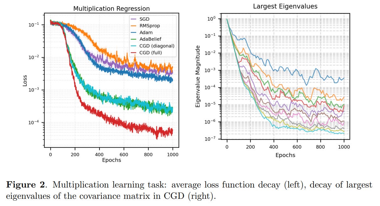 The results are compelling. On both tasks, the CGD methods performed exceptionally well. In the multiplication task, the "full CGD" optimizer, which leverages the complete covariance matrix, achieved the lowest final loss with rapid and stable convergence, outperforming all other methods (Figure 2). This provides strong evidence that the information contained in the off-diagonal elements of the covariance matrix is not just theoretically interesting but practically valuable for achieving better optimization performance.