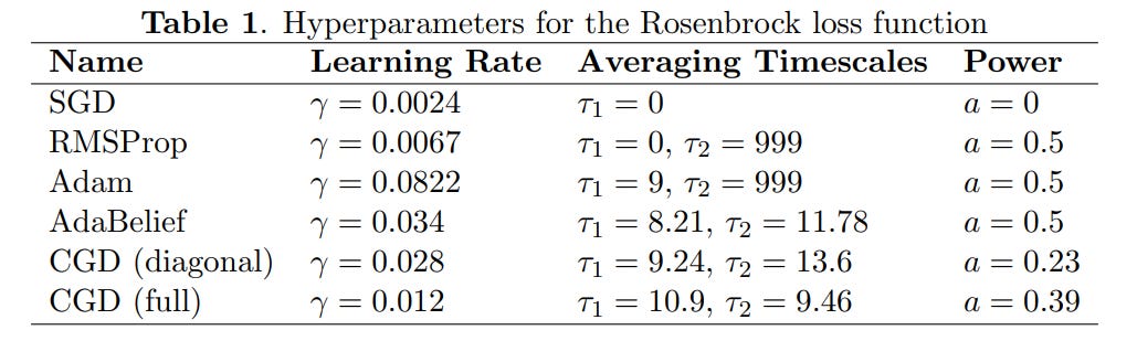 The authors test CGD (both diagonal and full versions) against SGD, RMSProp, Adam, and AdaBelief on two benchmark tasks: optimizing the Rosenbrock function and training a small neural network to perform multiplication.