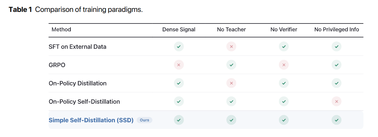 The prevailing consensus in the post-training era is that base models require rigorous, high-fidelity feedback to improve. Traditional approaches rely on SFT on External Data, which demands expensive human annotations, or complex reinforcement learning setups like GRPO, which necessitate execution sandboxes to generate verifiable reward signals. Other methods use stronger frontier models to generate synthetic trajectories, effectively capping the student’s potential at the teacher’s ceiling.