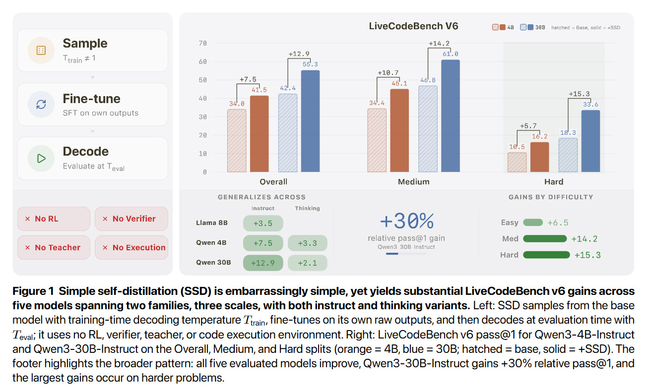 WHAT was done? The researchers introduced Simple Self-Distillation (SSD), a post-training method where a large language model fine-tunes on its own raw, unverified outputs. By generating samples under specific temperature and truncation configurations and directly optimizing a cross-entropy loss against those targets, the model achieves massive gains without reinforcement learning, verifiers, or a stronger teacher.