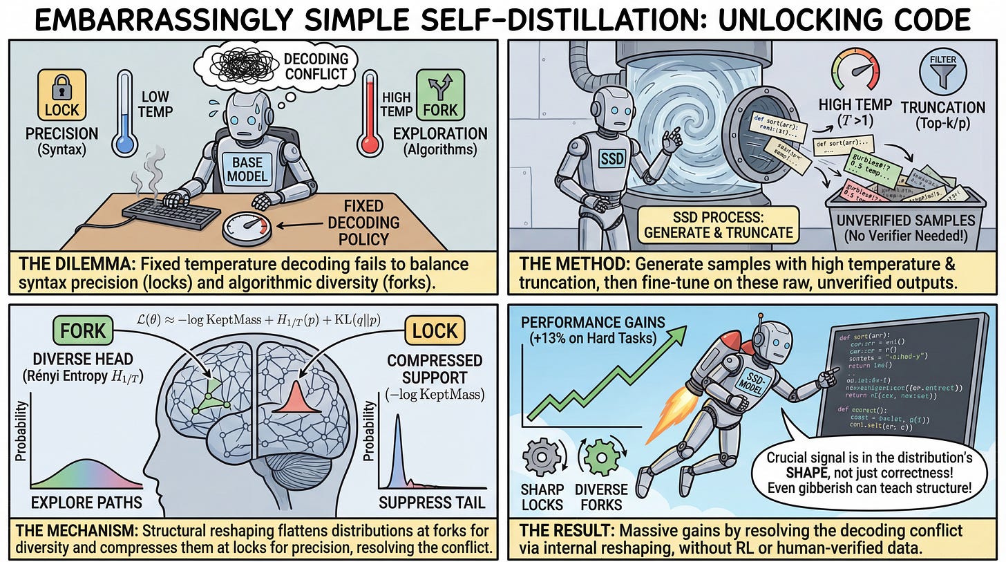 This paper shifts the paradigm by proposing that the bottleneck is not a lack of correct knowledge, but an inherent conflict in how models decode probabilities. Code generation presents contradictory demands. At certain syntax-heavy positions, the model must exhibit absolute precision, demanding a low evaluation temperature to suppress low-probability distractors. At other algorithmic branching points, the model must explore multiple viable paths, requiring a high evaluation temperature to avoid collapsing into a single, potentially flawed strategy. Because fixed decoding policies apply a single temperature globally, they force a compromise that inherently degrades performance at one of these two extremes. The authors introduce Simple Self-Distillation (SSD) to resolve this tension by structurally reshaping the base model’s internal distribution rather than tuning external decoding parameters.