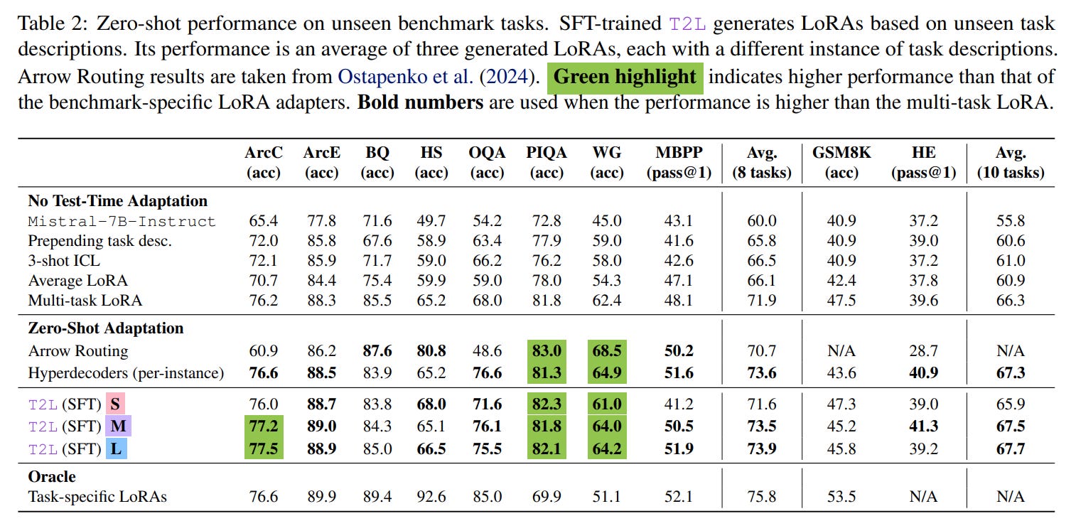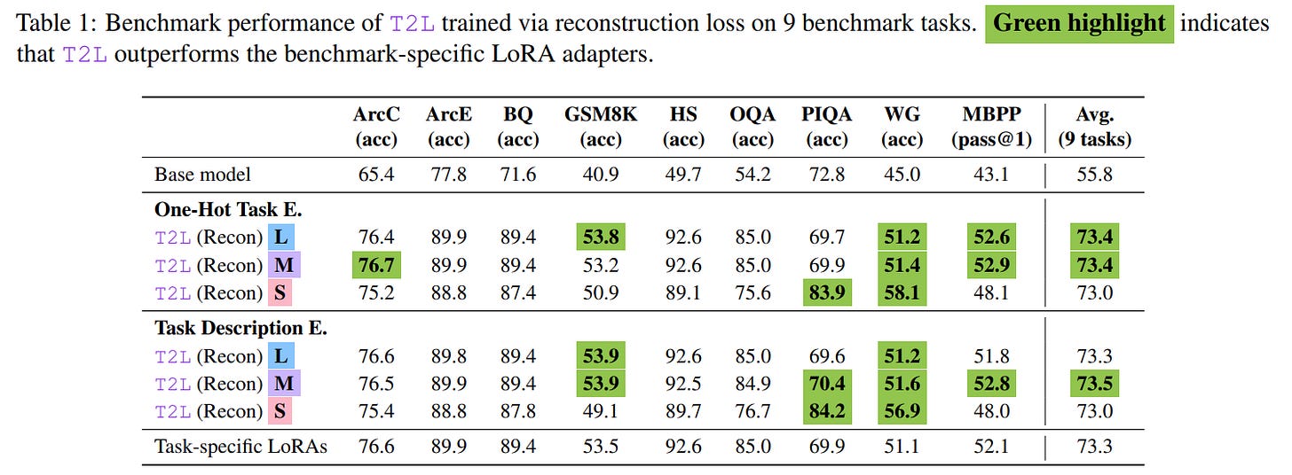 Editor note: I personally expect the next generations of LLMs to have adaptation capabilities like T2L embedded. It’s so cool from a business perspective.
