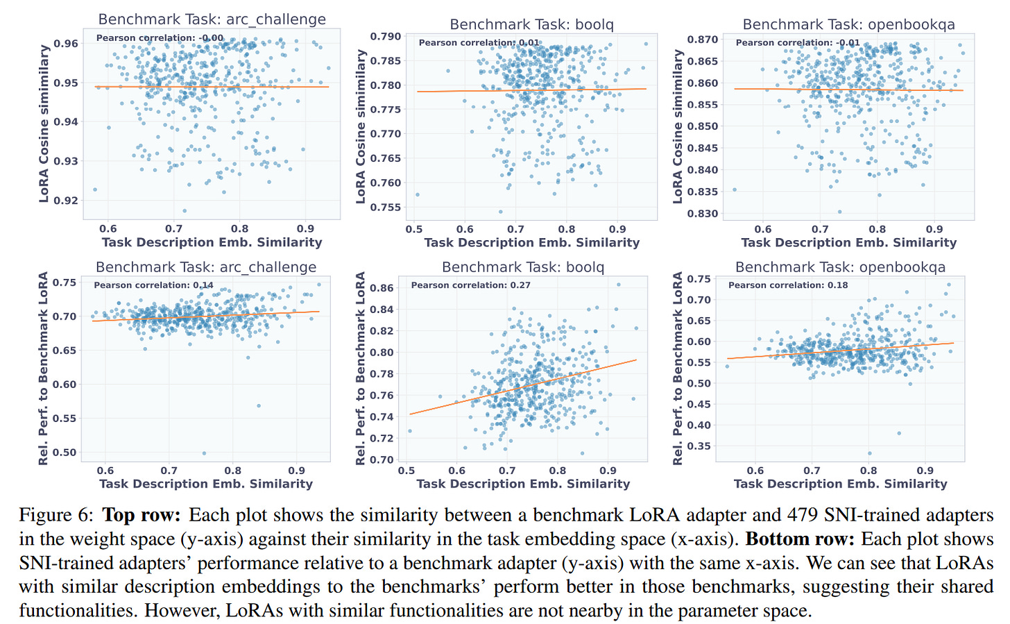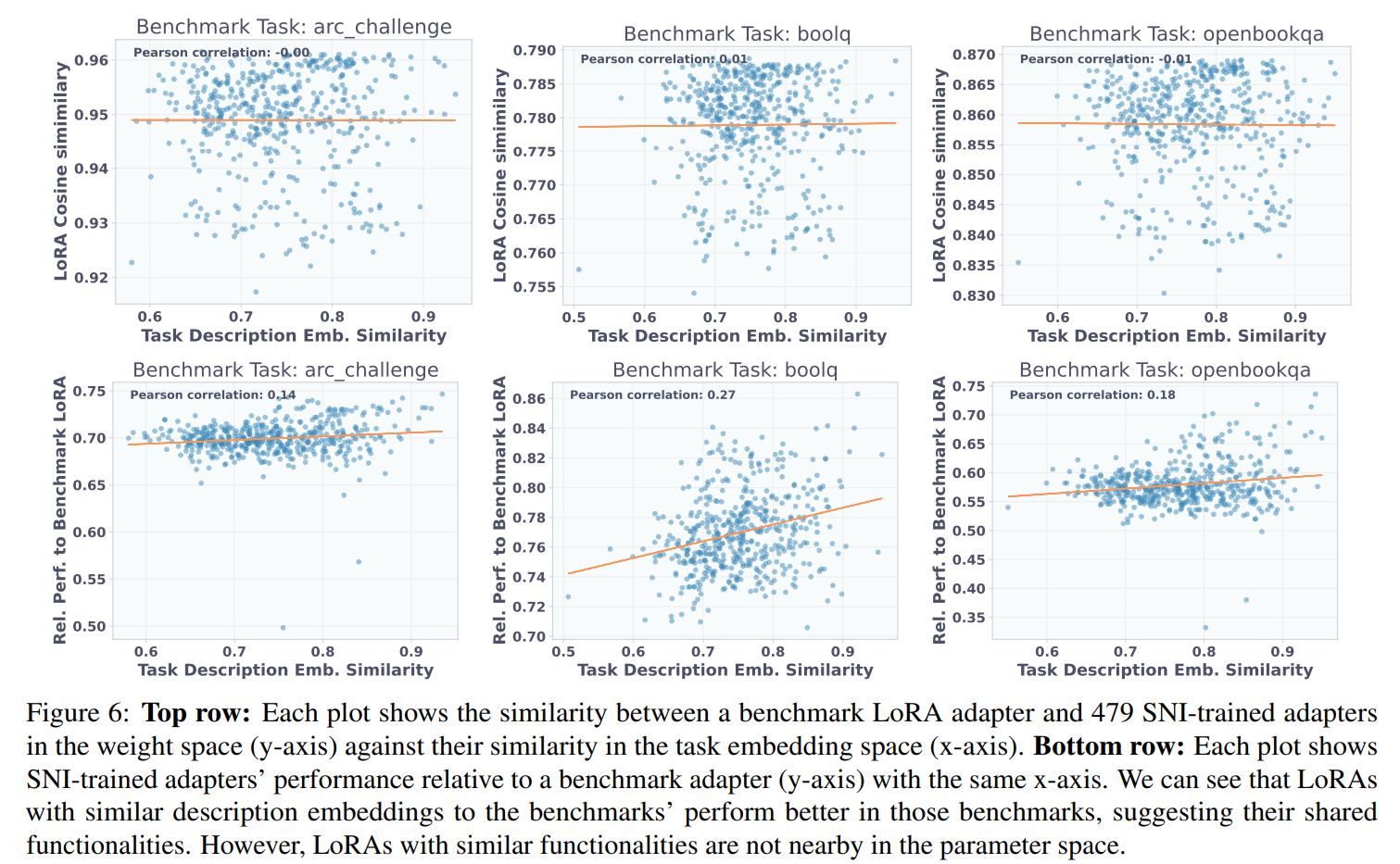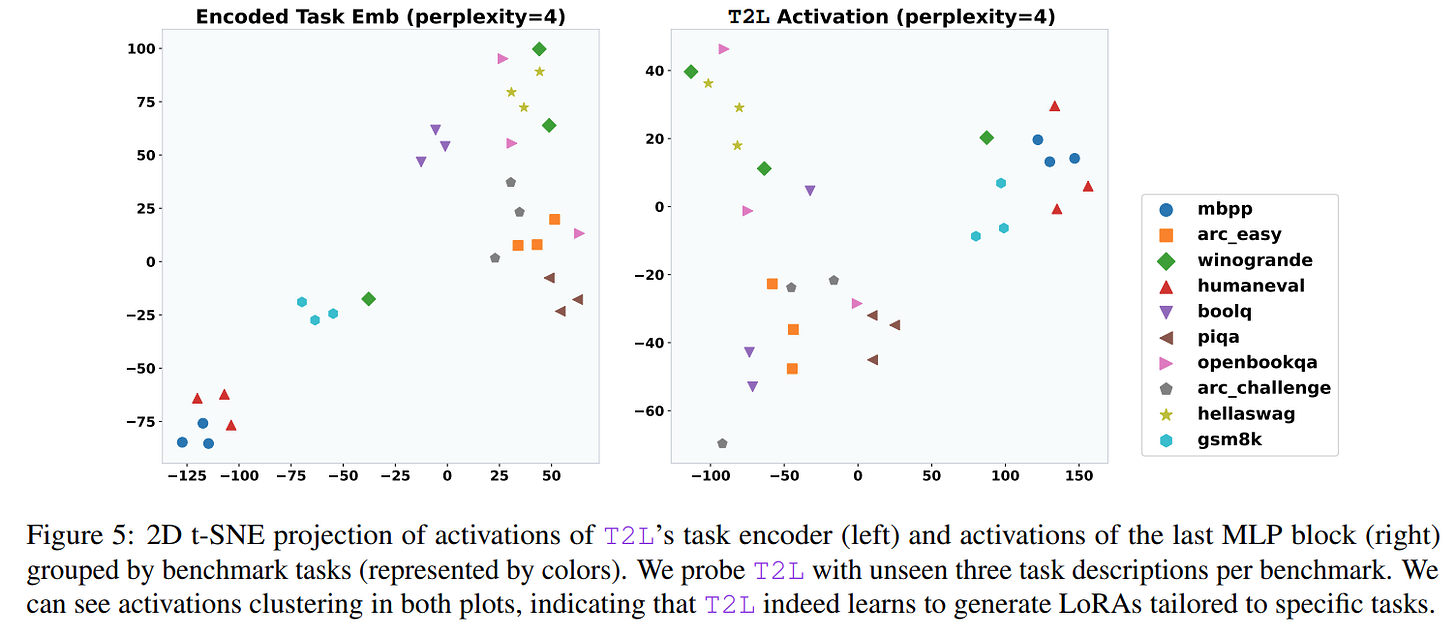 Furthermore, visualizations of T2L's internal activations confirm that it learns to generate distinct adapters for different tasks, with semantically similar tasks clustering together in the latent space (Figure 5).