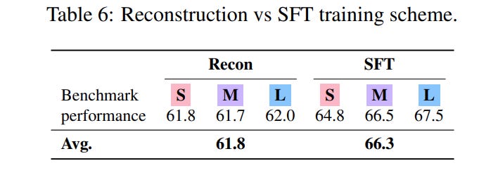 Ablation studies further strengthen these findings. Performance scales positively with the number of training tasks, and SFT proves decisively better than reconstruction for zero-shot generalization (Table 6).