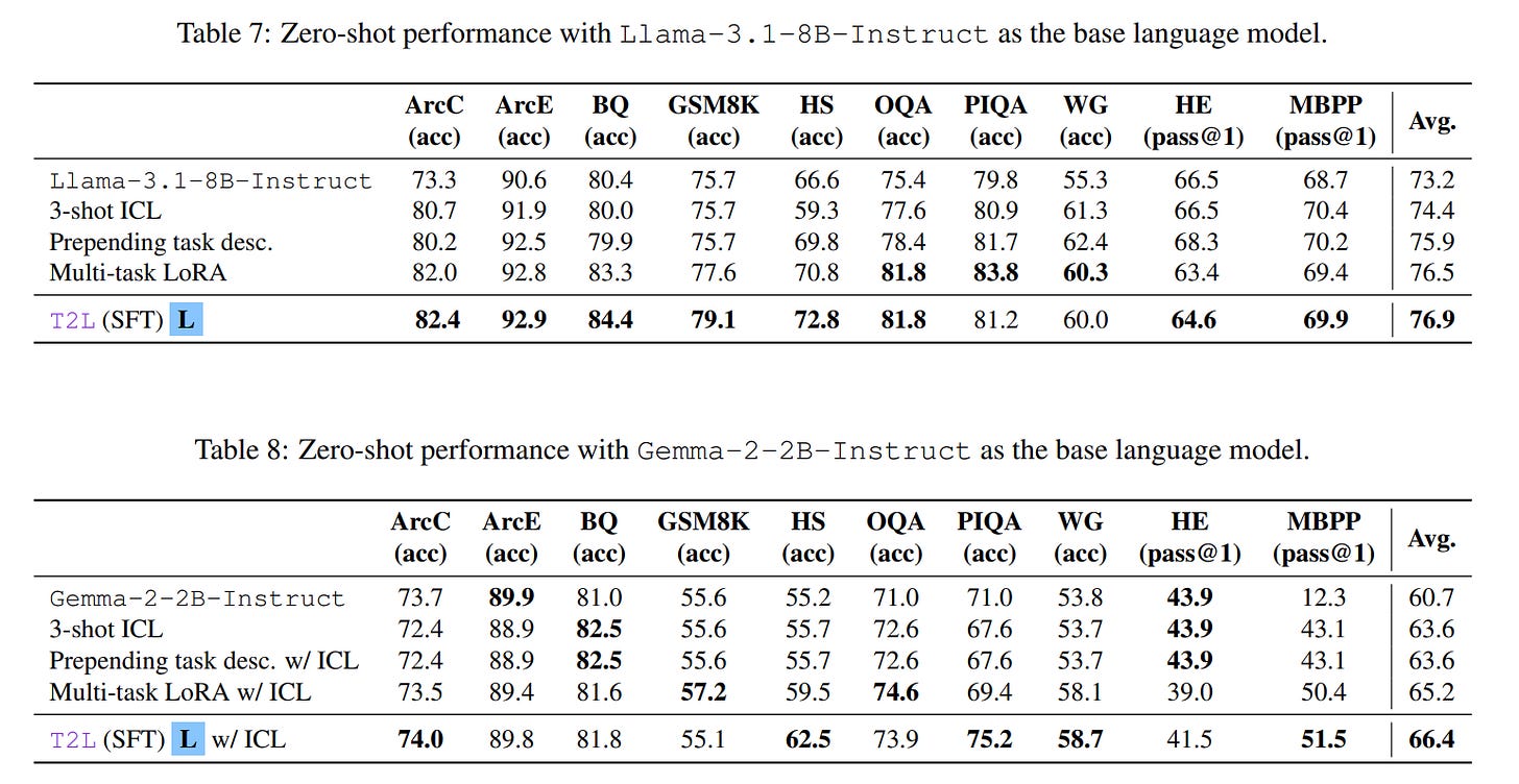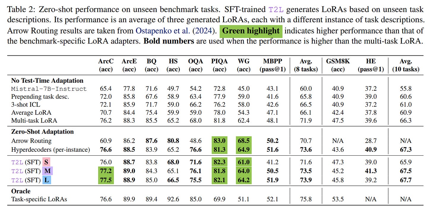 WHY it matters? T2L represents a significant shift from the conventional, resource-intensive paradigm of LLM specialization. By translating human instructions directly into model adaptations, it democratizes the ability to customize foundation models, removing the need for deep ML expertise or vast computational resources. The SFT training approach is particularly impactful, as it unlocks true zero-shot generalization, allowing T2L to create effective adapters for entirely unseen tasks. This "instant adaptation" capability not only makes LLMs more flexible and steerable but also drastically reduces the computational overhead, paving the way for more dynamic, responsive, and accessible AI systems.