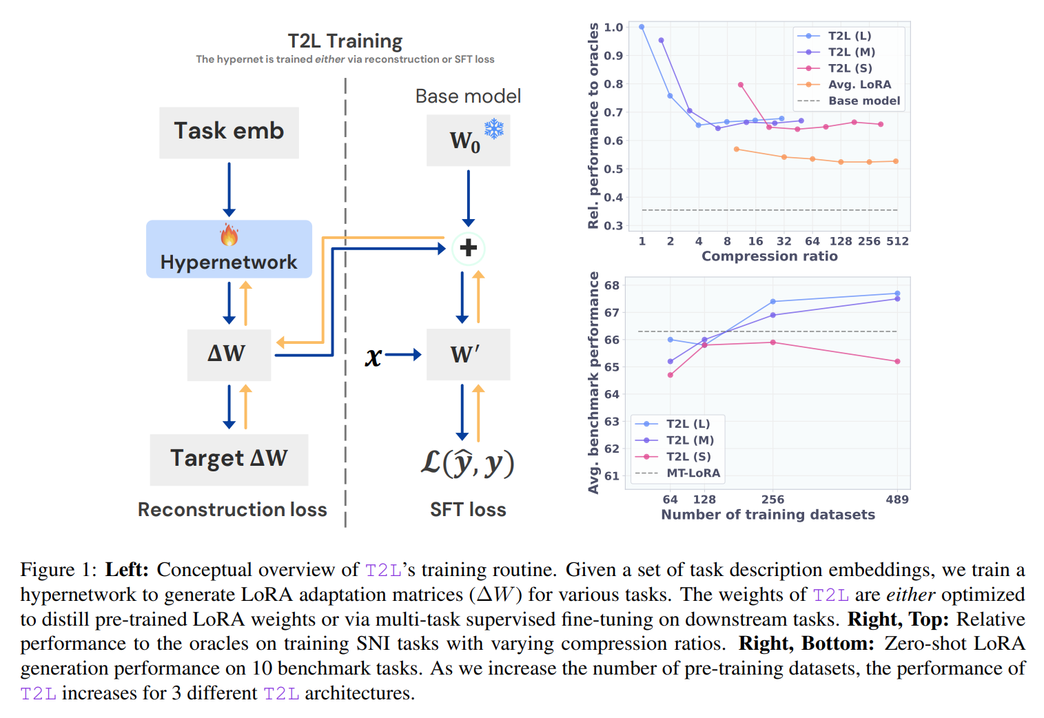 Supervised Fine-Tuning (SFT): In this end-to-end approach, T2L is trained directly on a diverse distribution of downstream tasks. Instead of matching pre-existing weights, it learns to generate LoRA adapters that minimize the fine-tuning loss on those tasks.