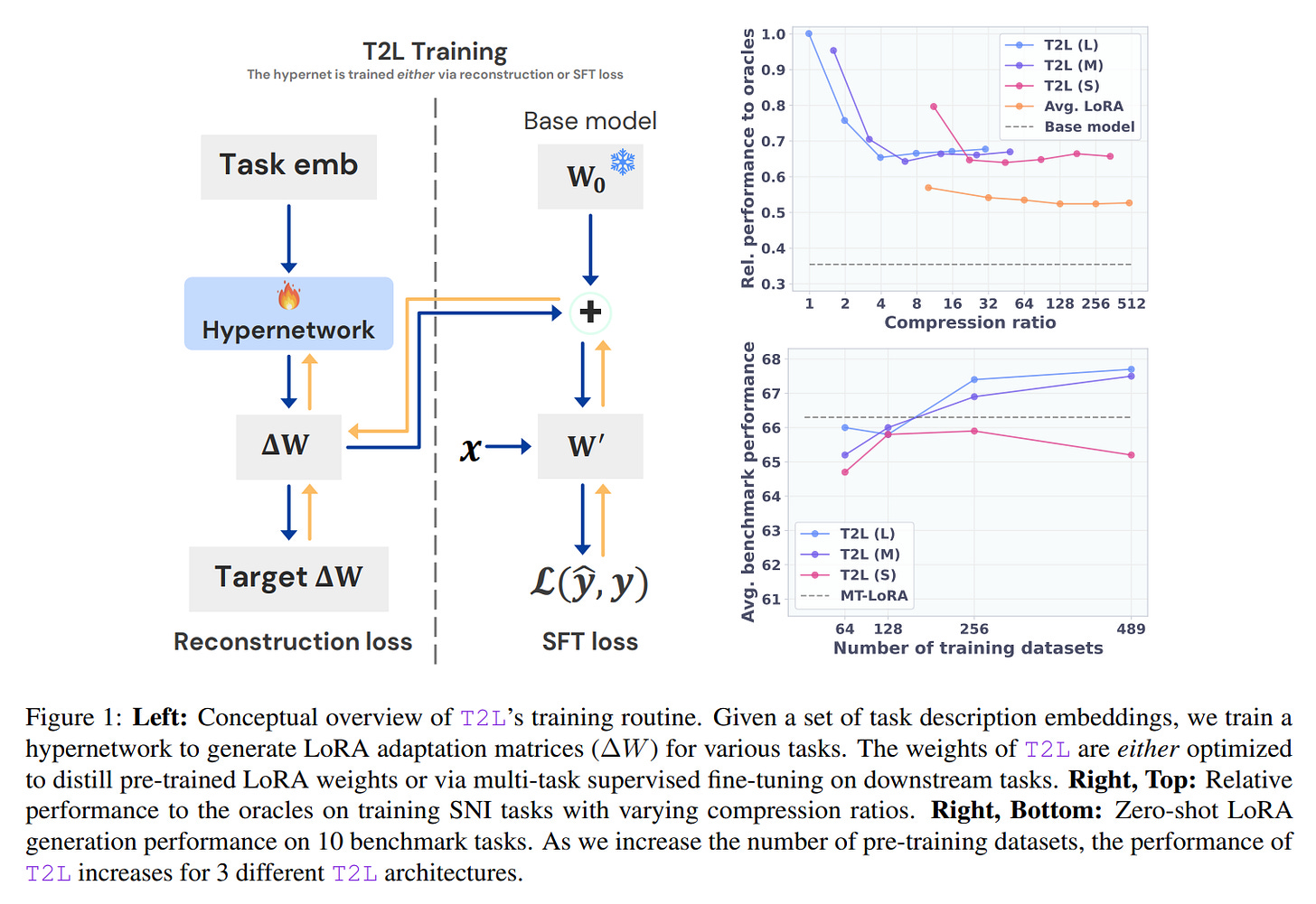 LoRA Reconstruction: Here, T2L is trained to distill a library of pre-trained, task-specific LoRA adapters. This demonstrates an impressive capability for compression, where T2L can encode hundreds of LoRAs into its own, much smaller set of parameters.
