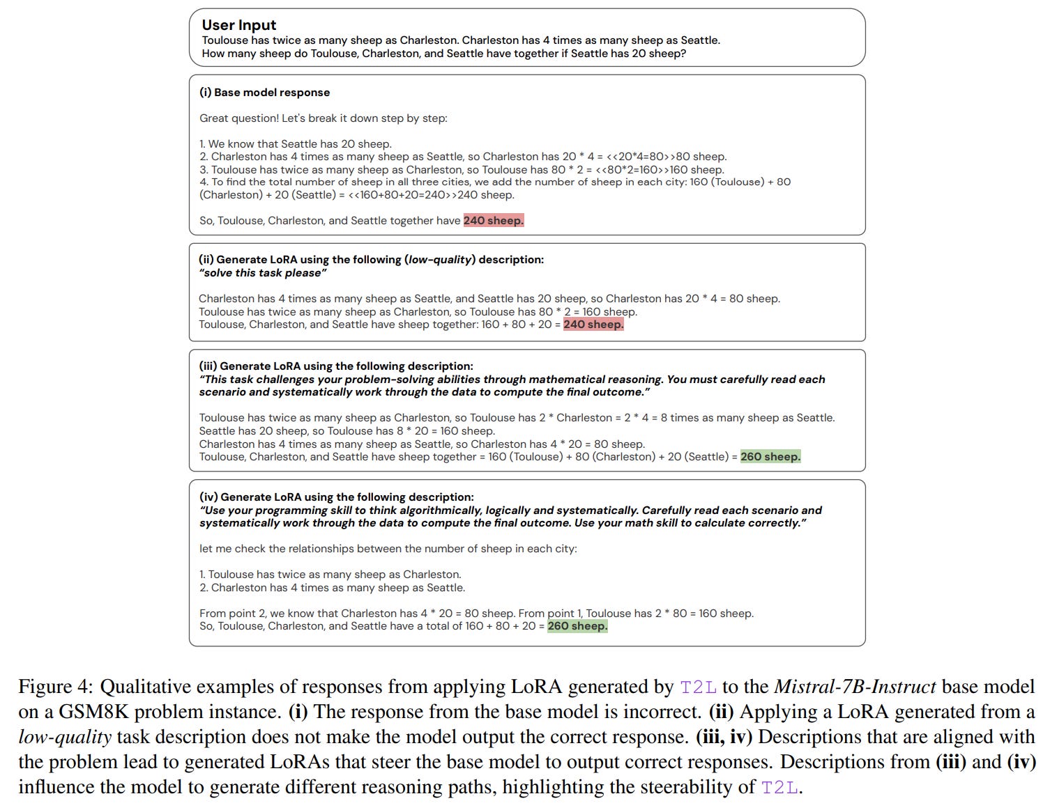 Qualitative examples compellingly demonstrate the model's steerability, showing how different phrasings of a task description can lead the base LLM down different, yet still correct, reasoning paths (Figure 4).