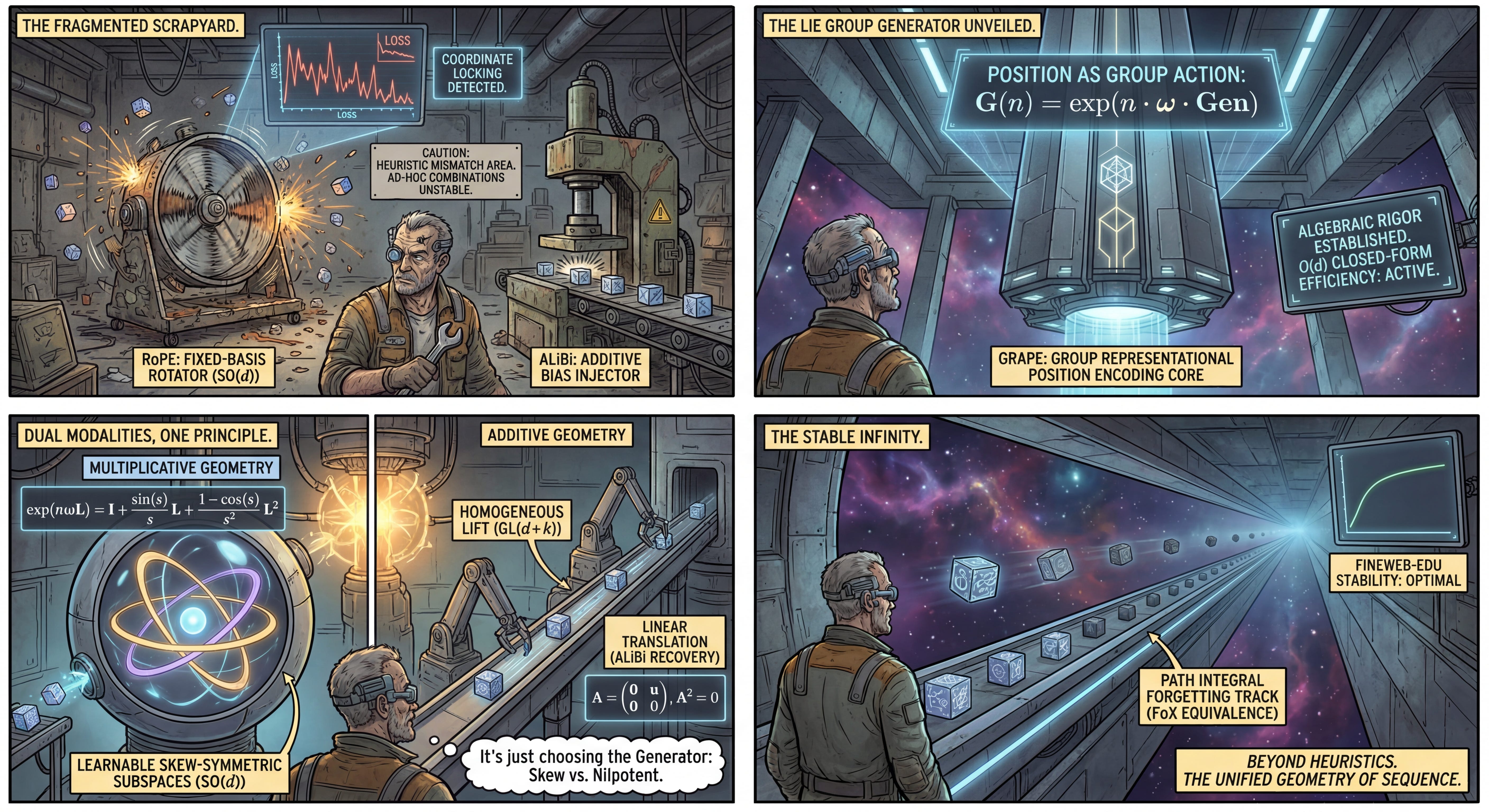 WHAT was done? The authors introduce GRAPE (Group Representational Position Encoding), a unified framework that derives positional encodings from group actions. By formalizing positions as elements of a Lie group acting on the token representation space, GRAPE unifies two distinct families: multiplicative rotations (recovering RoPE via SO(d)) and additive biases (recovering ALiBi and Forgetting Transformer via unipotent actions in GL(d+k)).