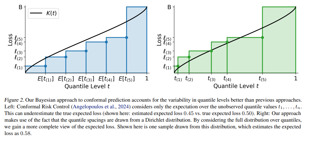 WHAT was done? This paper reframes frequentist conformal prediction through a Bayesian lens, modeling the problem of bounding expected loss as an application of Bayesian Quadrature. By leveraging a classic result from distribution-free statistics—that the spacings between ordered quantiles of i.i.d. samples follow a Dirichlet distribution—the authors develop a nonparametric framework that remains distribution-free. Instead of producing a single point estimate of risk, their method computes the full posterior distribution of a provable upper bound on the expected loss, which they call L+.