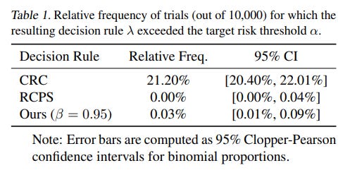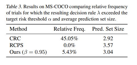A key limitation of standard conformal methods is their focus on marginal guarantees. This means the promised error rate (e.g., 5%) holds on average over many hypothetical calibration and test sets. While theoretically sound, this can be misleading. In any single, real-world deployment, the actual error rate might be significantly higher. The authors’ experiments highlight this vividly: the popular Conformal Risk Control (CRC) method exceeded its target risk threshold in 21% of trials on one synthetic dataset (Table 1) and a striking 45% of trials on the MS-COCO dataset (Table 3), despite its marginal guarantee being valid. For any application where a single failure is costly, this is a significant concern.