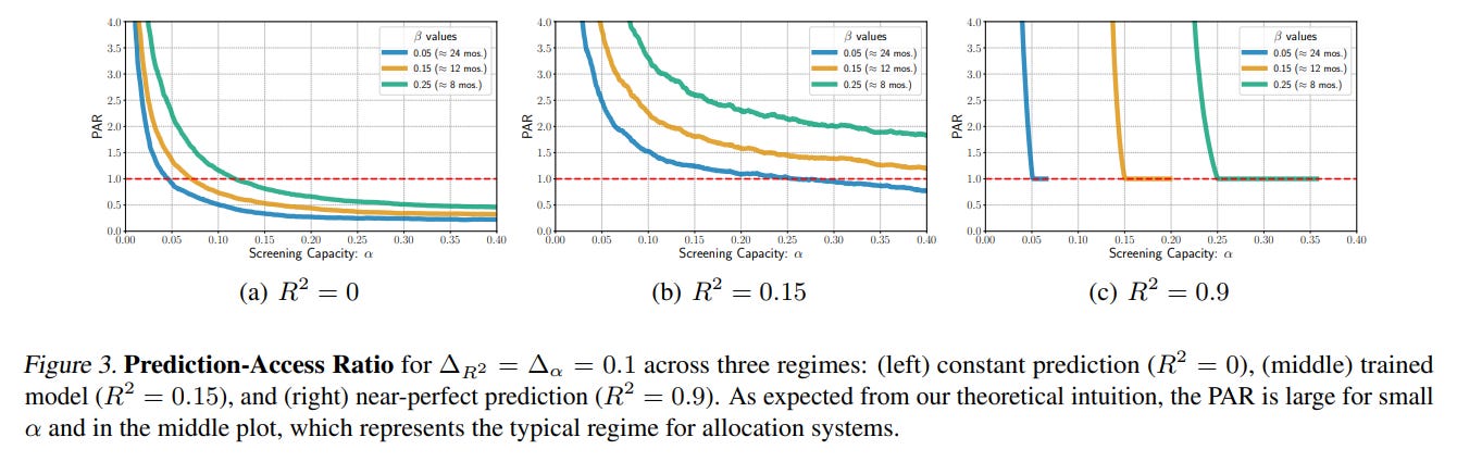 The results are striking and align with the theory. The trained model achieved an R² of 0.15 on the test set. This is not a sign of a "bad" model; rather, it's a realistic level of performance for complex social prediction tasks, a finding consistent with large-scale studies like the Fragile Families Challenge (Salganik et al., 2020). For this model, the PAR consistently remained above one, indicating that expanding screening capacity offers a greater marginal benefit than improving the model's predictive accuracy (Figure 3). For example, to guarantee that 75% of high-risk individuals are screened, the system needs the capacity to screen about 25% more people than the at-risk group itself, a direct overhead caused by imperfect prediction.