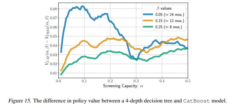 Furthermore, a comparison between the complex CatBoost model and a simple 4-depth decision tree showed that the significant increase in model complexity yielded only a minor (1-8%) improvement in policy value (Figure 15). This suggests that in many practical settings, the pursuit of marginal accuracy gains with sophisticated models may offer diminishing returns when compared to more straightforward operational investments.