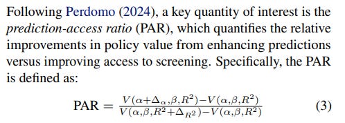 The PAR is defined as the marginal gain in welfare from expanding access divided by the marginal gain from improving prediction (Equation 3). This leads to an elegant decision rule: a social planner should expand access whenever the marginal cost ratio of access to prediction (C_Access / C_Pred