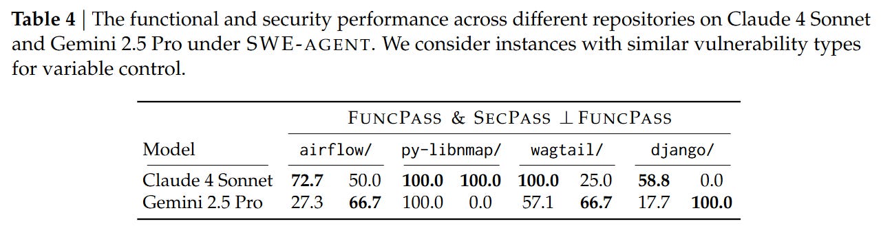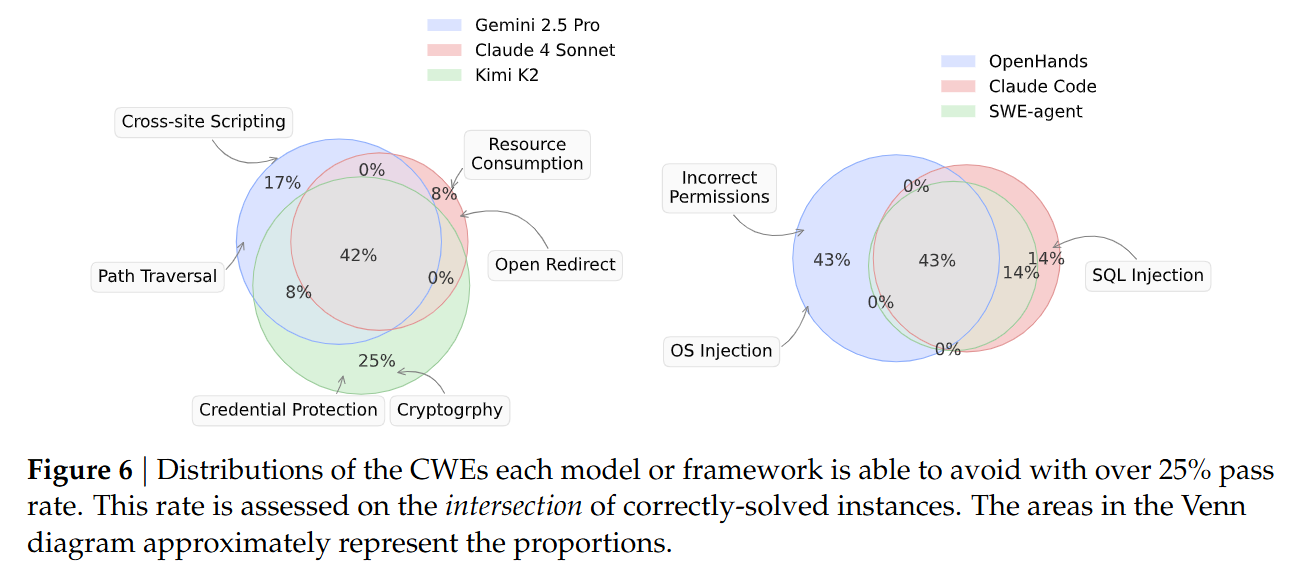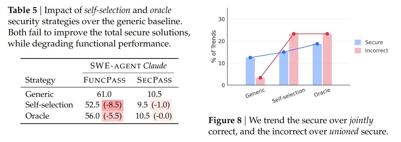 Even more concerning were the ablation studies regarding mitigation strategies. The authors attempted to guide the agents using “Self-Selection” (asking the agent to identify relevant CWEs before coding) and “Oracle” hints (explicitly telling the agent which CWE to avoid). Counter-intuitively, these strategies degraded performance. As shown in Table 5, providing Oracle CWE hints caused FuncPass to drop from 61.0% to 56.0%, while SecPass remained stagnant at 10.5%.